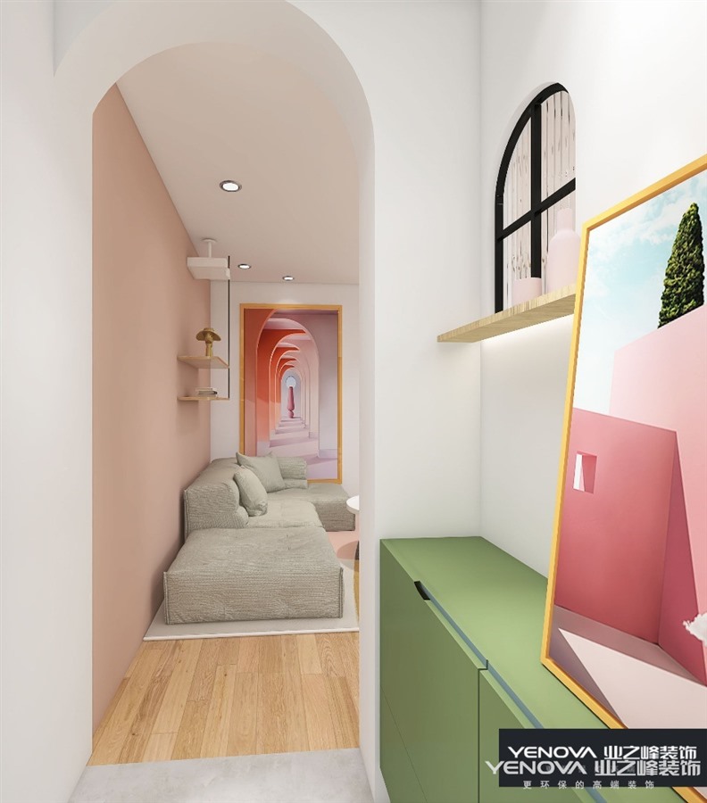 在设计造型上,利用圆弧为元素,打破空间方正,使空间看起更加的有趣味,尤其是在门洞和主卧吊顶,采用圆弧形的设计,不仅可以消弱房间梁体的突兀感,使空间也具灵动感。