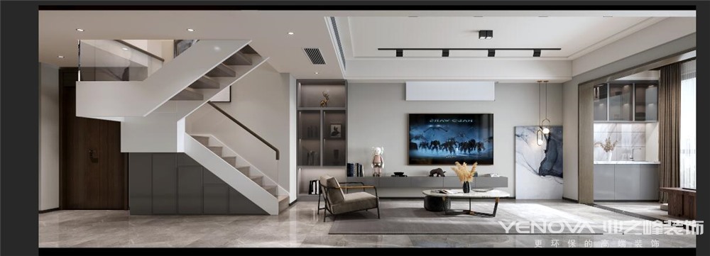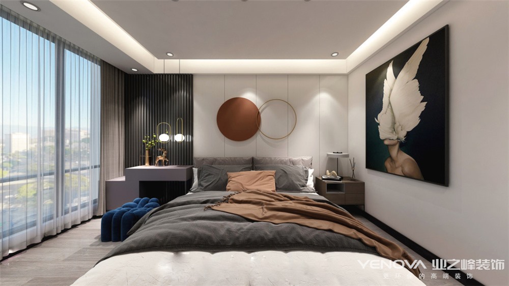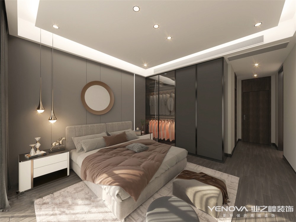 在设计中以香槟金和灰色为主色调,倾向于高雅的色彩,让整体空间显得简约、时髦且富有轻奢气质;背景墙装饰柜低调轻奢,深色的木纹的天然纹理于细节中彰显质感。大面积的落地窗,也悄悄然,延展了整个空间。在布局上以动静分区划分,讲究空间的对称性,使得房屋看起来整齐划一;在设计中还采用了很多现代元素,简易的家具搭配可以在呈现空间温馨大气的格调之余,又牵引出浓浓的时尚高雅范儿。