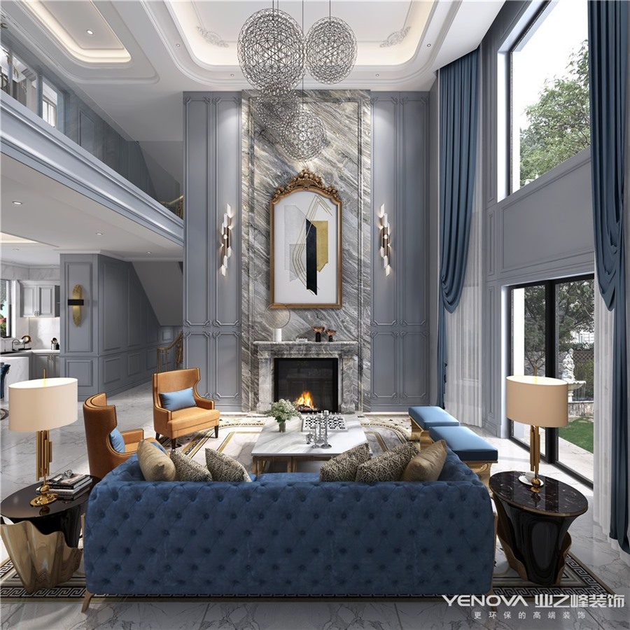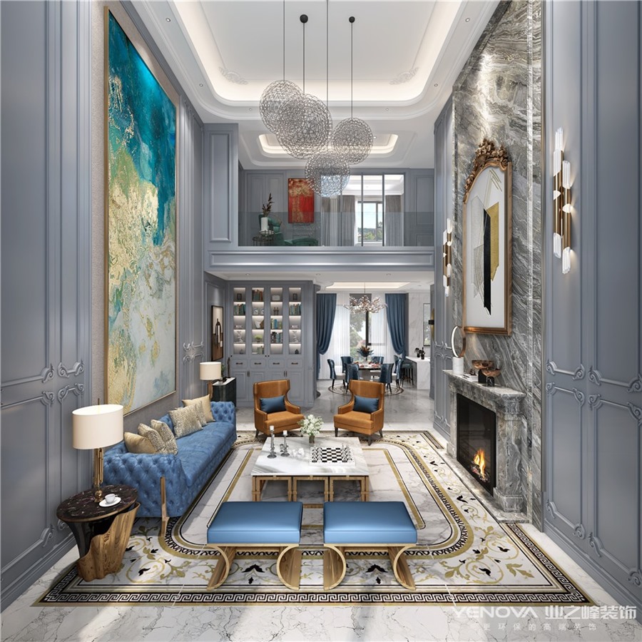 若说客厅的亮点,莫过于壁炉式背景墙,大理石自然纹理提升着整个空间的格调,上侧的大型挂画,与两边的金属感的壁灯以及电子壁炉的使用搭配起到非常好的装饰效果。生机盎然的绿植,营造活力十足的空间氛围,蓝色单人皮沙发气质满满,异形边几,创意十足,这种富于雅趣的生活氛围,更能体现出主人对居家生活的高品质追求。