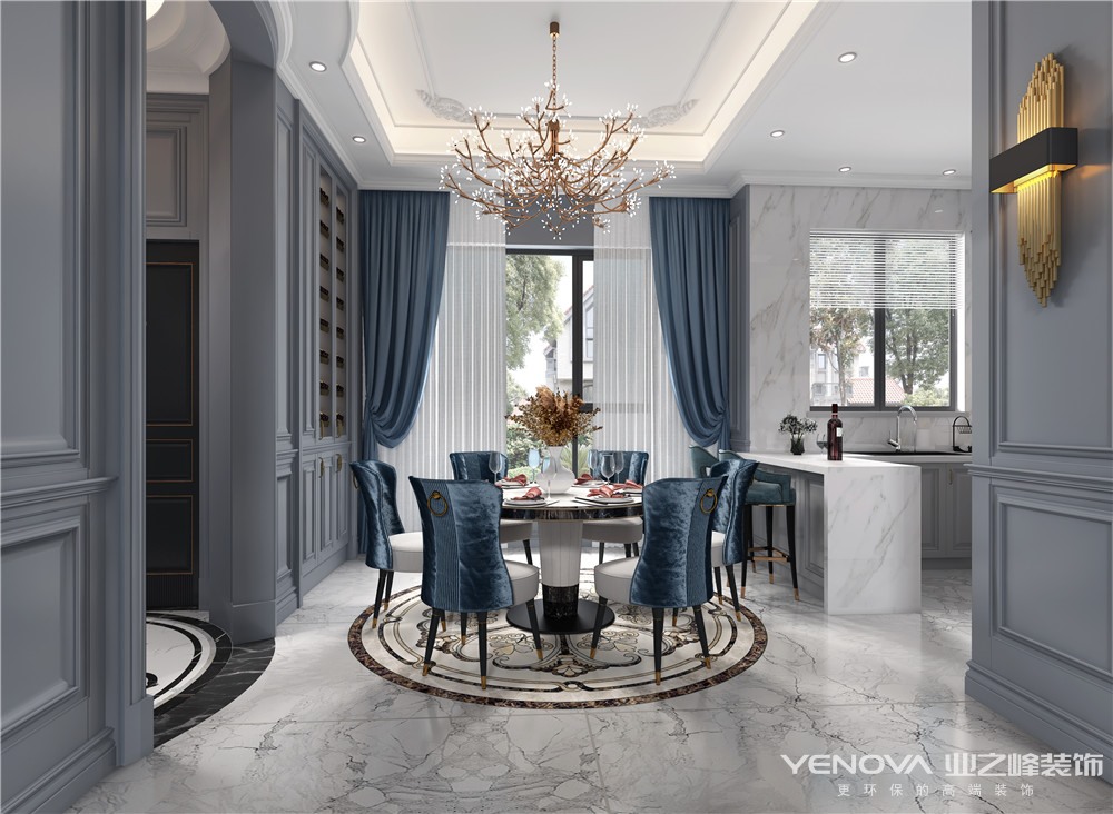 餐厅整体延续客厅的风格,丝绒的高级质感搭配大理石的温润内敛,瞬间让空间的奢华感上升到一个新的高度,打造出精致的现代家居氛围。