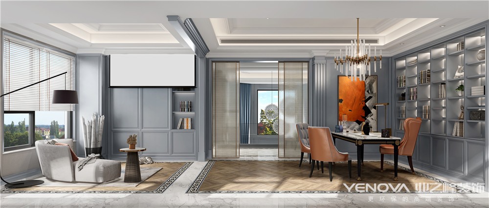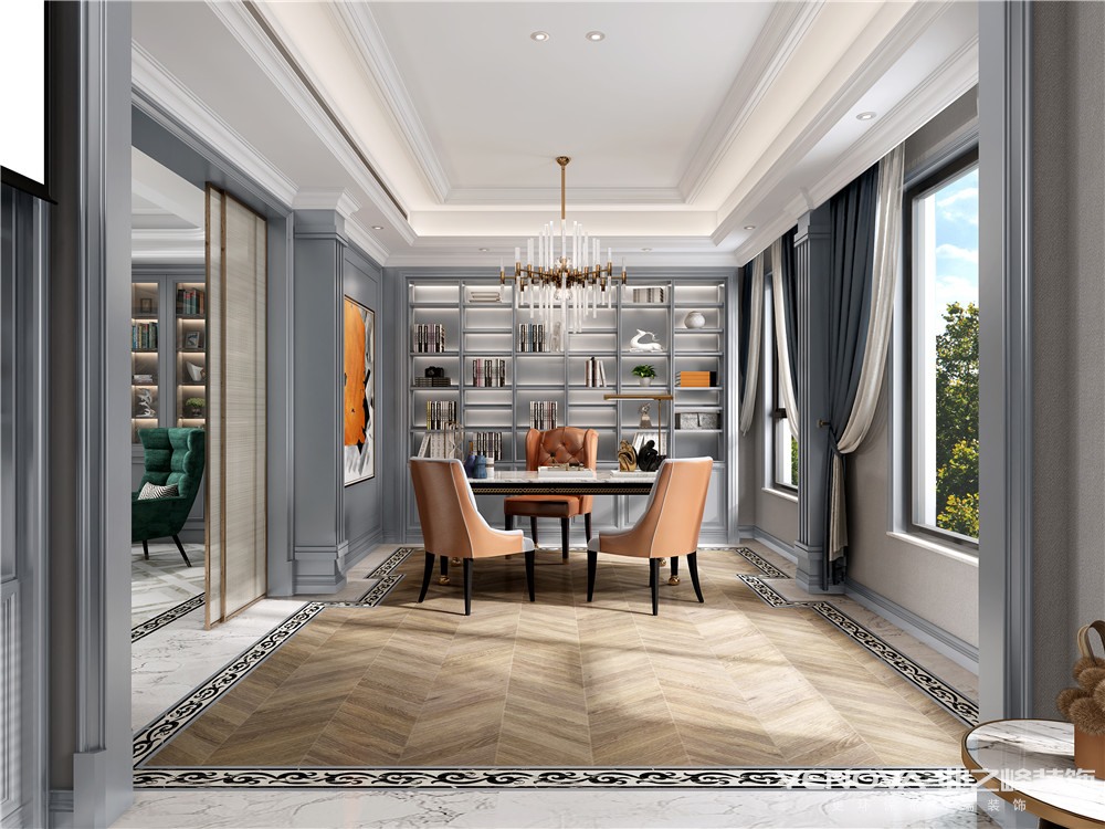 书房立体感十足的石膏线条,让整体更加有线条感和流畅性,筒灯直线照明,光线也更加匀称舒适。