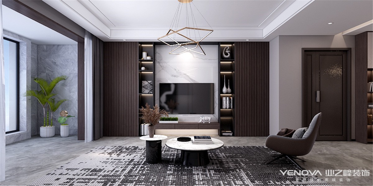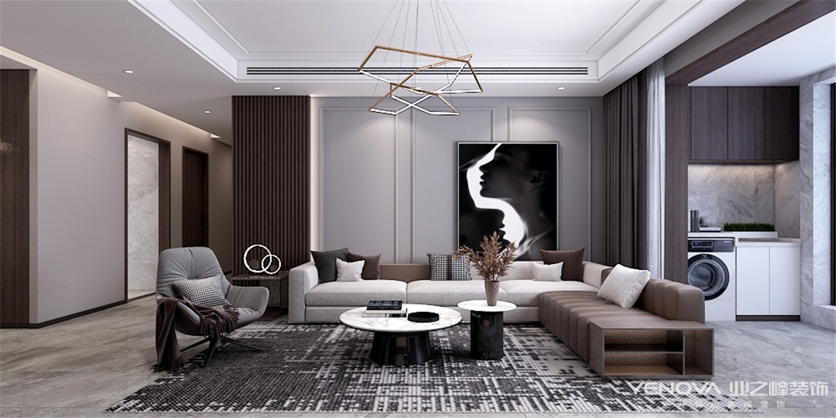 设计说明:电视墙采用了柜体与隐形门结合的手法拉长了电视墙的视觉,沙发墙运用简单的线条以及反光木格栅板让整体的现代感得以提升,