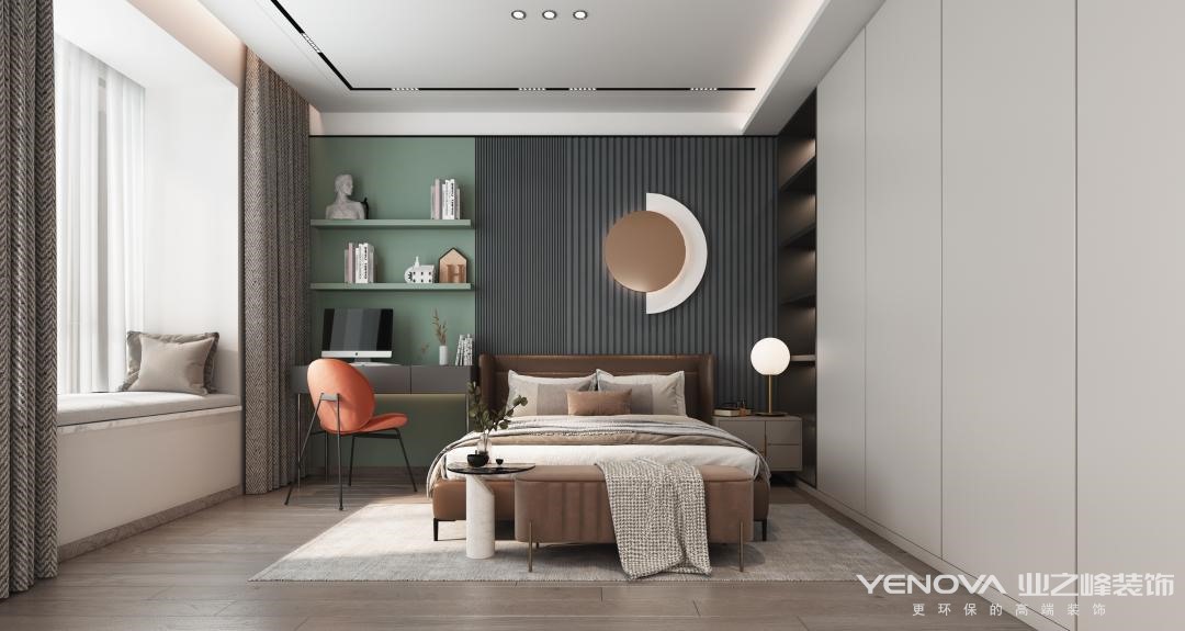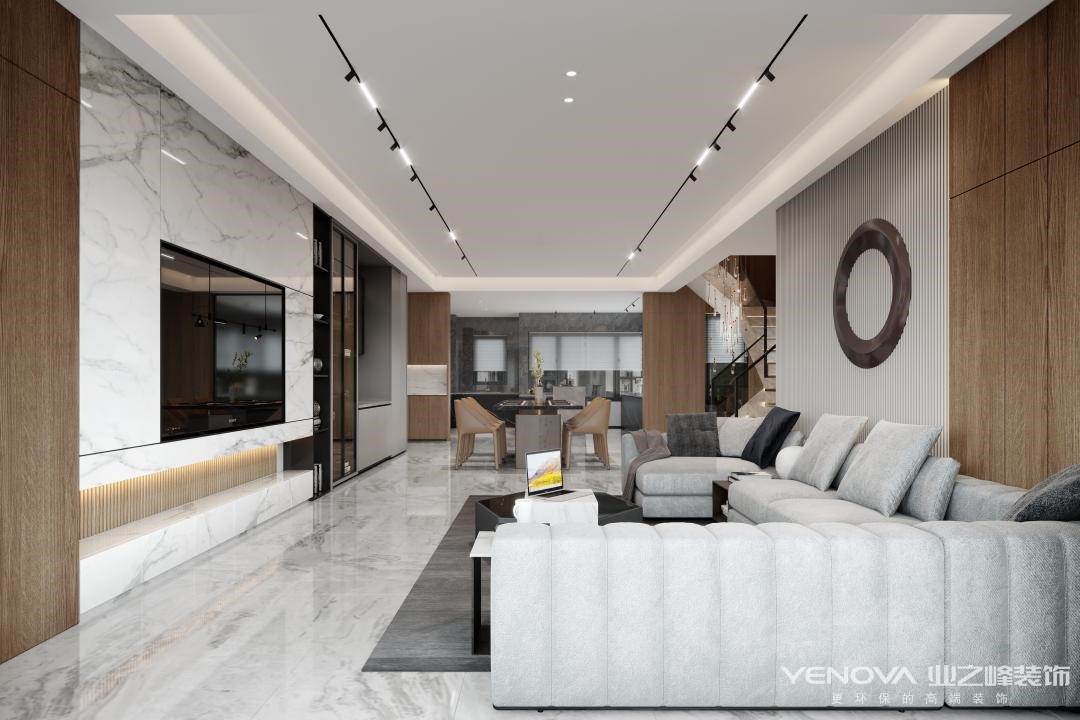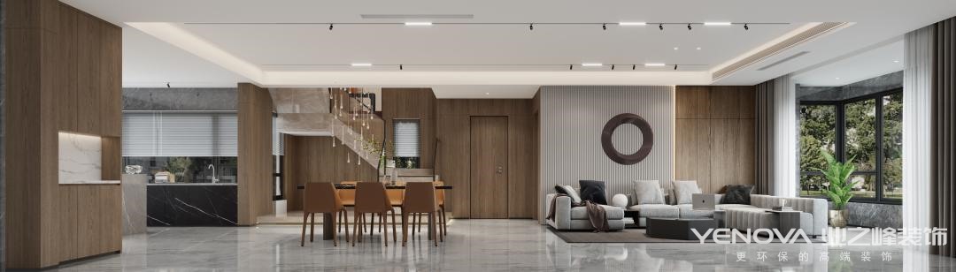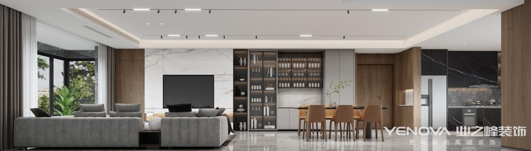 空间以金属、皮革的中性色调为主用色彩的纯度传递细腻的质感造型简洁线条流畅的家具组合搭配营造出稳定、协调、温馨的空间感受满足现代年轻家庭的轻奢需求。