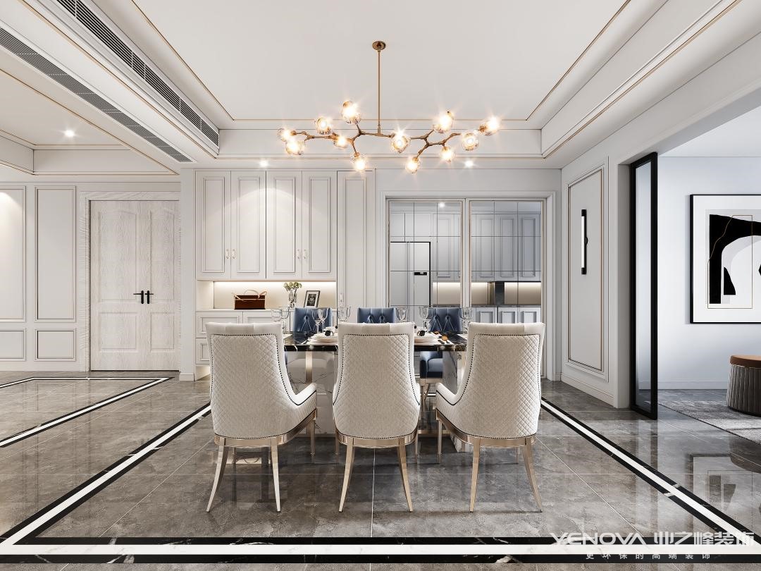 客厅以灰、白色为主调,奠定了客厅纯净优雅的格调。丝绒美式三人沙发与窗帘的材质,有响应的效果,低调内敛,却又流露出一种高贵优雅的气质。金色吊灯与落地灯有锦上添花的效果。阳光透过窗落在几何图形的地毯上,绿植摇摆着向太阳问好,室内与室外相互通联,内外归一,自成一景,让人沉醉于此,不见纷扰之色,只在意境当中。从餐厅看向客厅,整体格调一致。中厨功能完整,中厨做饭、炒菜、煲汤,洗水果、烧茶、榨果汁、豆浆、干粮储备柜......厨具的设计嵌于规则空间中,更显时尚精致。