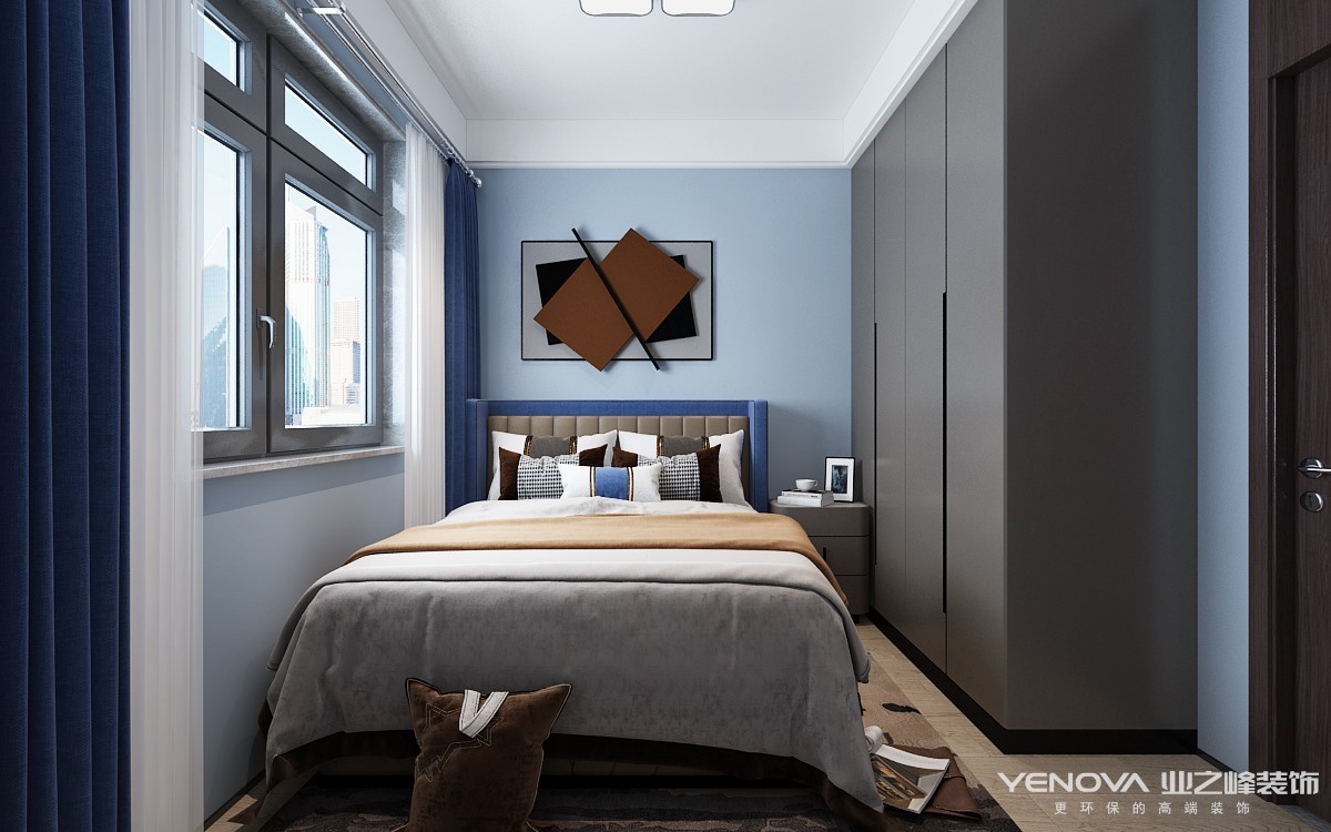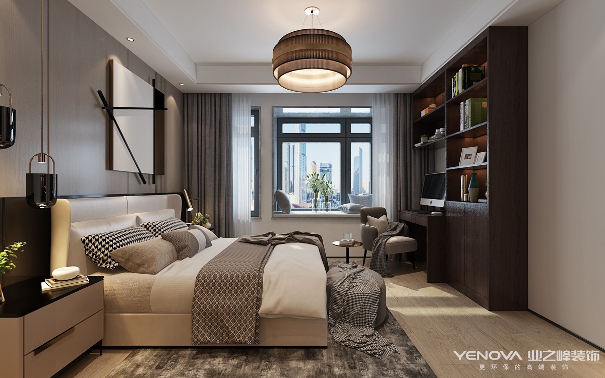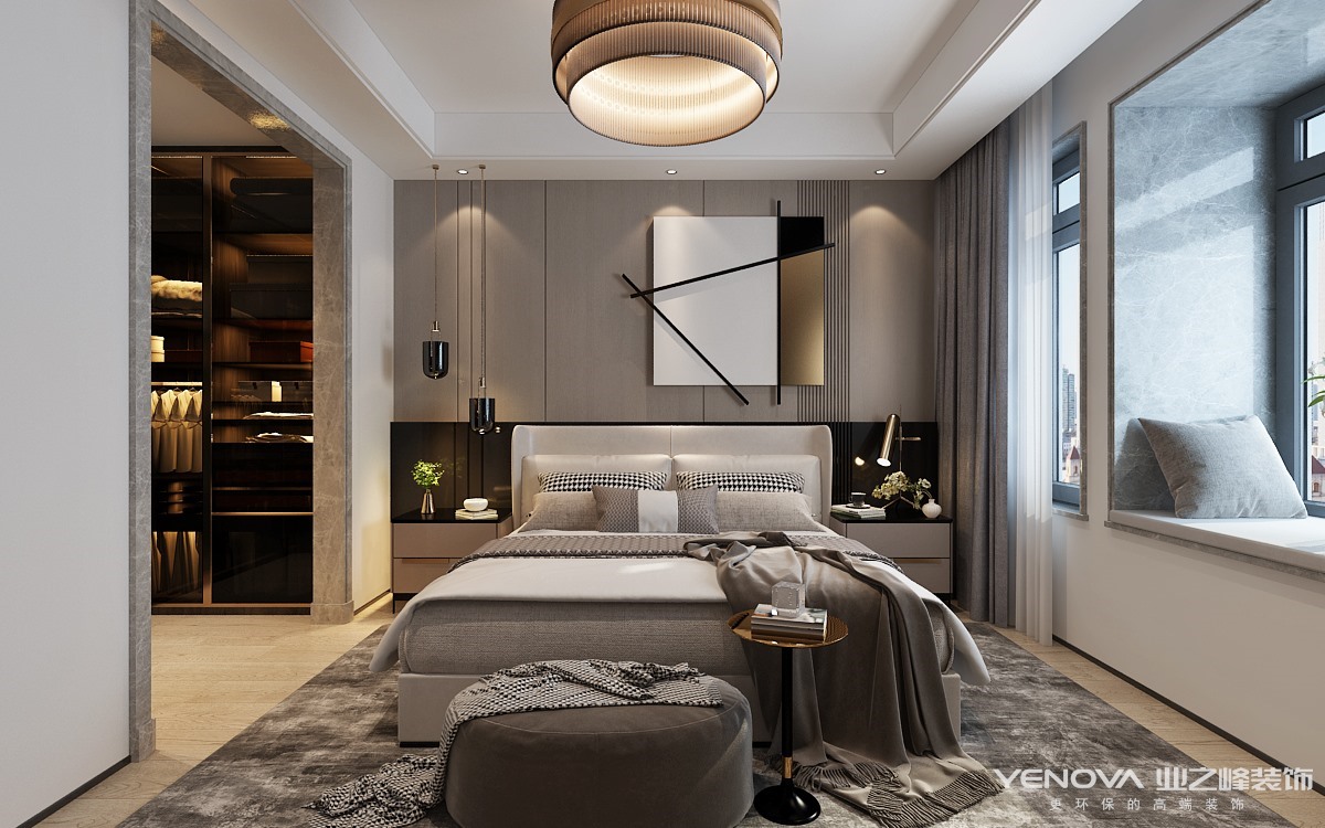 现代轻奢侈风格虽然也是一种现代风格,但不同于传统的现代风格,现代轻奢侈与色彩的运用形成了鲜明的对比。常用的高级黑色和高级灰色作为一种表现,给人一种空间整洁的感觉。并将添加亮度较高的驼色、象牙白色等,为卧室呈现一种温馨的氛围、时尚典雅的风格。