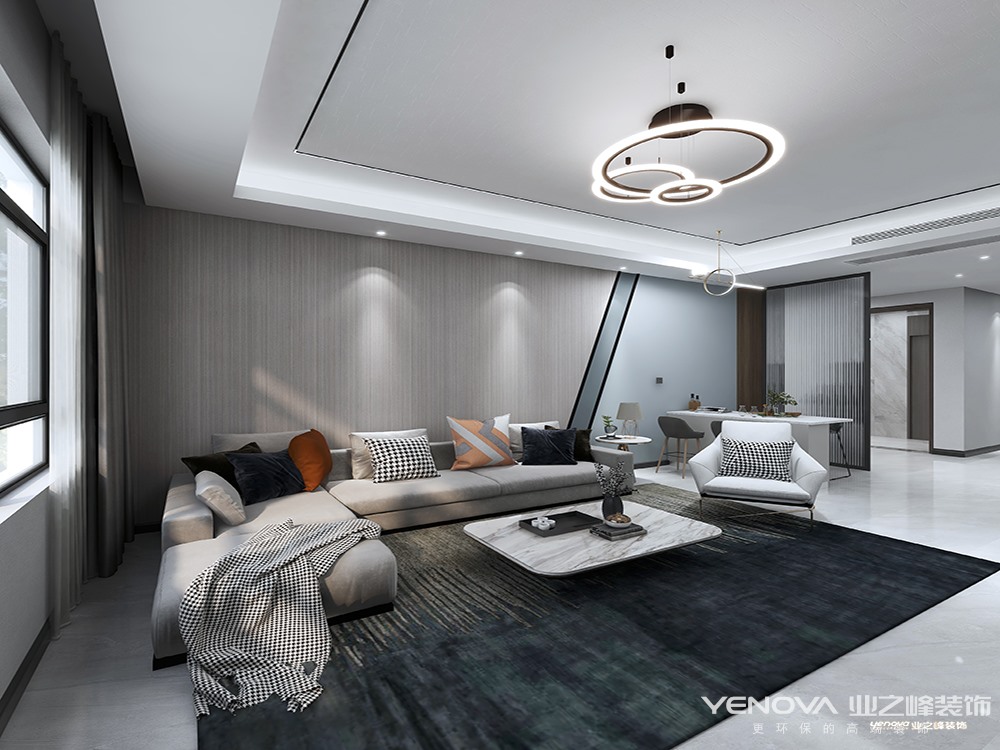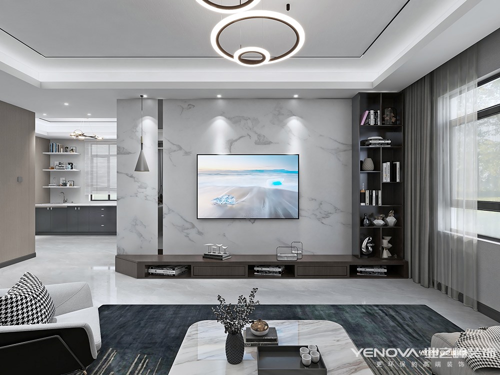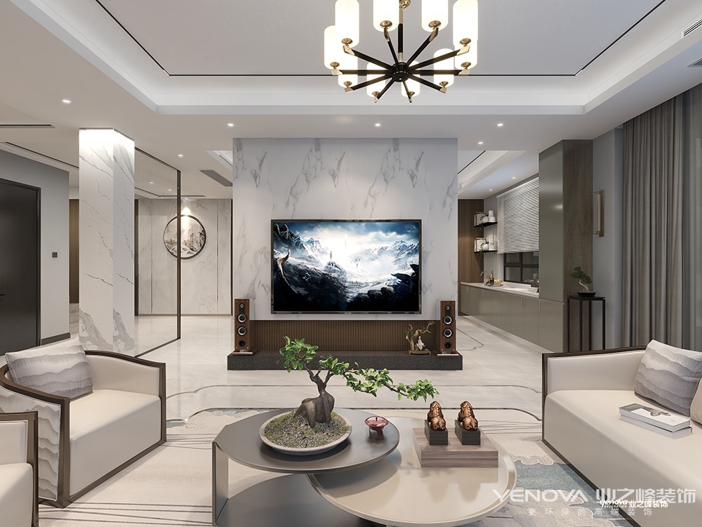 本项目以外环境“打造立于自然之间,内环境融入现代生活方式”,以最独特 最鲜明的大块面白色流淌于家具 配饰 墙面装饰之间,印刻着居住者的生活痕迹,营建差异化内外空间环境的独特气质。