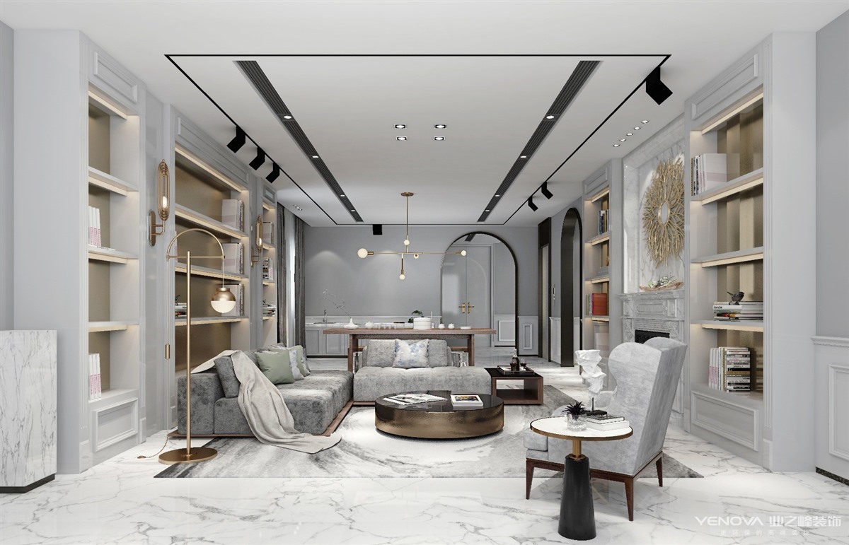 负一层打造家庭厅,整体硬朗的线条布局,搭配金属突出贵气,用软装去体现法式的氛围;一层、二层空间超高挑空,别墅的气派自然体现,用现代的家具来替换法式家具的厚重,使得空间更加轻盈