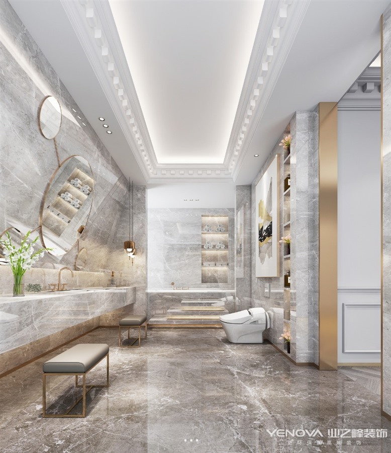 法式装修设计风格繁复而精细、考究细节。本案利用雕花、石膏线条等去精准传达法式风格的优柔华贵。