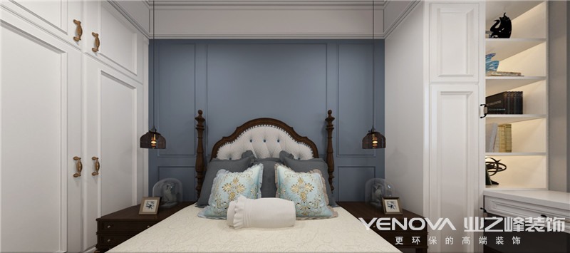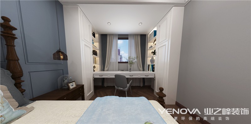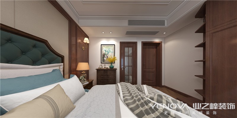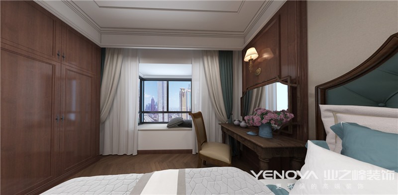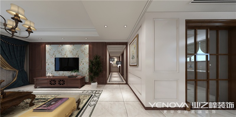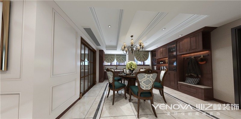 本案户型方正,南北通透,南边一大阳台面积很大,结合客户需求,给客户把阳台划分为两个部分,一部分为洗衣晾晒阳台使用,一部分为休闲阳台使用,定制茶水柜和休闲椅组合椅的布置。业主喜欢的是那种复古优雅的美式风格,入门处设置换鞋凳、鞋柜组合定制柜,功能齐全兼顾家庭生活的收纳储物的需求。客厅的布局和家具的选用都是遵循复古大气的原则,深色实木家具,加上电视背景墙和沙发背景墙的美式线条的对称,突显出美式风格的复古优雅感,电视背景墙采用两边实木护墙板,中间花鸟壁画的结合,复古美式的优雅感立马呈现。餐厅的吊顶设计依据实际梁的位置高度又人为的制作一个假梁,分成三个长方形空格依次排列,一进门感觉整个空间是开阔延展的,同时这个吊顶的设计和过道吊顶的设计争相呼应。主卧空间床头背景墙也同样采用两边护墙板,中间素色壁画点缀,让人觉得优雅宁静。整个户型空间墙面采用护墙板、线条、壁画相结合,地面采用浅色地砖配合波打线,加上实木家具、软装摆件的材质、颜色的搭配,让整个空间复刻出一种复古优雅的美式风格。