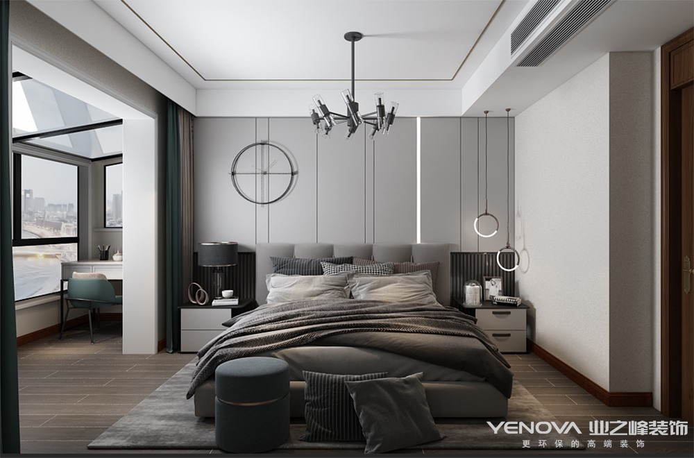 中式具有中国传统风格文化意义在当前时代背景下的演绎,是对中国当代文化充分理解基础上的当代设计。中式是传承传统中式风格的精髓,通过与现代潮流的对话碰撞而产生的创新。软装色彩上以中国红和黛蓝色作为点缀,中国红,中国传统颜色,山川之间,黛若苍穹 在大气的灰色调子中,用之点缀,起明朗之效果。典雅的色调,精致的细节,充满中式底蕴的文化表现,是锦粹,锦上添花的美感。在软装上采用了棉麻,丝光,金属,木材等高品质贴切生活的材质诉说着新中式、新艺术的生活态度,通过盆景等自然元素带来的依靠感,坚强感,生机感,整个空间塑造出沉稳安静的格调,散发着舒缓的意境,休息会客舒适自如。