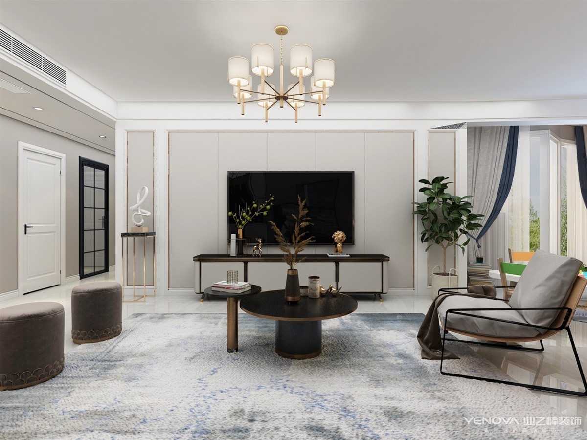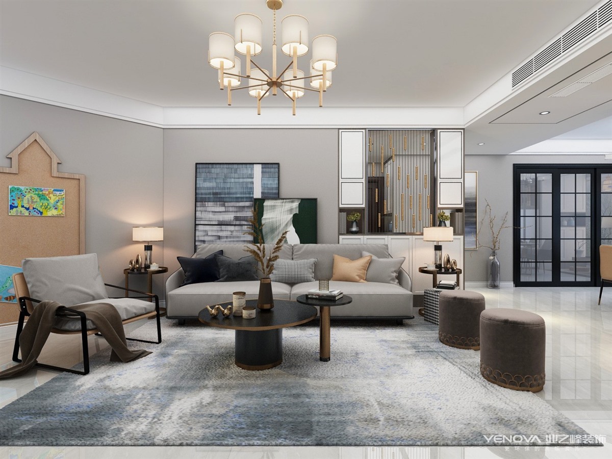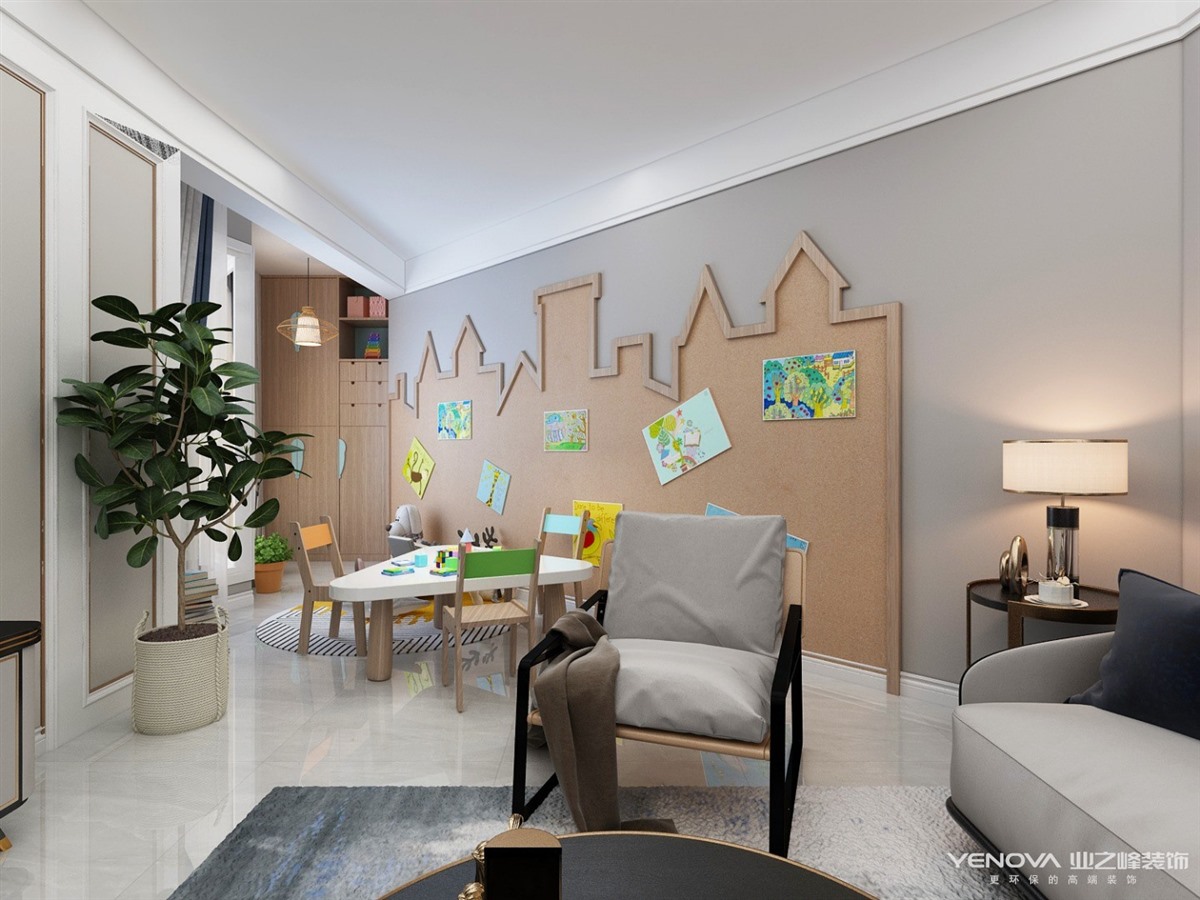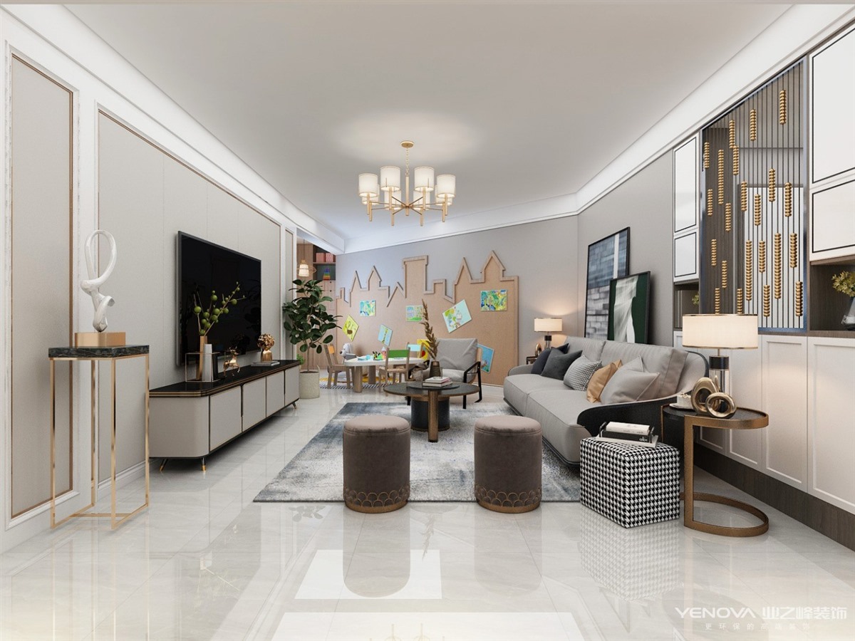 新世界阳光花园夫妇又两个孩子,因为是一个异型的户型客厅有着很大的空间,在异型的位置为小朋友专门设计了图书角和玩耍区域,进门处的玄关设计的恰当好处弥补了沙发背景墙的一角,也让进门时多了一点神秘。