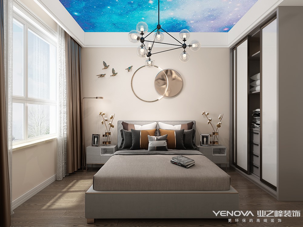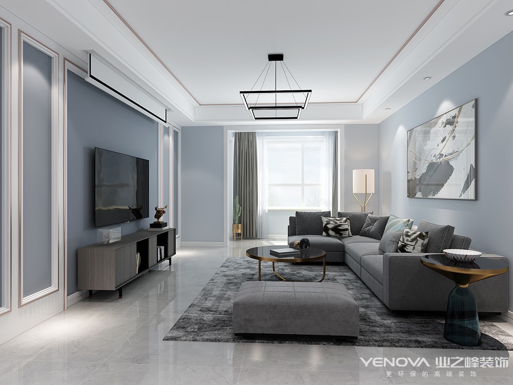 本套案例的业主,房子面积很大,但是却喜欢简约,同时提出不想要传统的白色简约,于是想办法在简约的基础之上,加入一定的流行元素让简约变为轻奢,墙面大面积用了灰蓝色调
