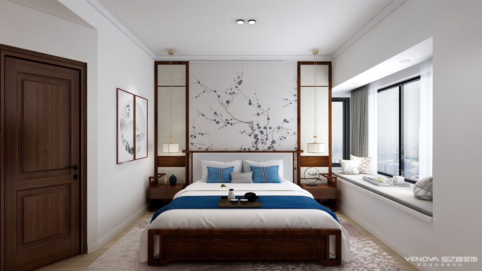 卧室整体空间选色素雅,尽显视线的静默与深沉,秉承简约舒适的理念,一张舒适的大床,极简的床头柜,搭配中式元素的背景墙和吊灯,为休憩提供一个宁静舒适浪漫的睡眠环境