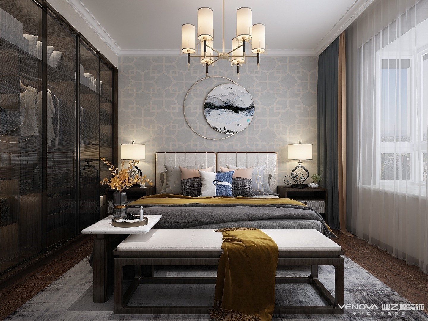 空间通过装饰,格调与品位,是这组设计的代名词,设计师力图营造温馨舒适视觉和居住感,舍弃浮华,强调造型简单,装饰有度,唤醒居者本真的欲望以及返璞归真的体验。设计师很巧妙的运用了优雅沉静的灰,橙配色,将卧室的气氛烘托出来。