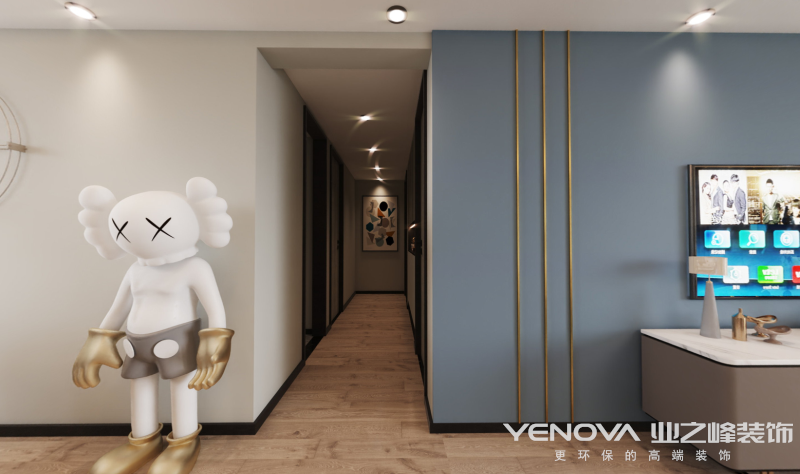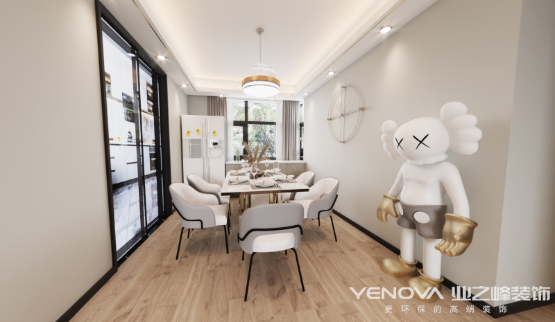 此空间以舒适为核心。此方案废弃了北边的阳台,做了西橱柜,以此来扩大厨房的使用面积,解决此户型中厨空间太小的问题。整体方案上设计了三室两厅两卫,主卧为套房。在风格上选择了现代轻奢风格,原木色地板配上浅灰色乳胶漆,使整个空间显得干净整洁,让整个空间浑然一体。墙面和吊顶运用了少量的玫瑰金金属线条