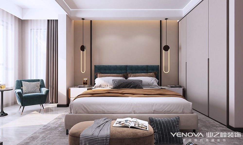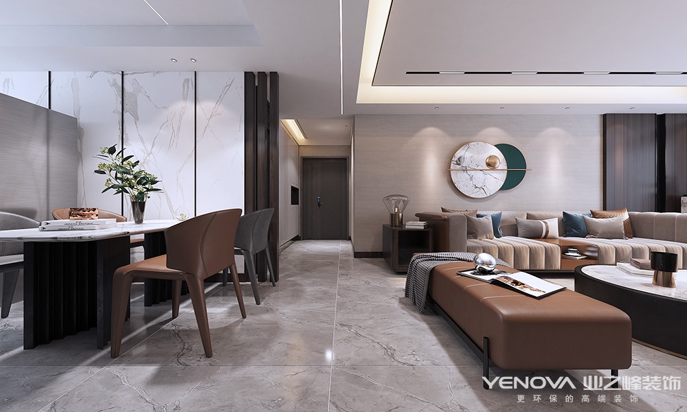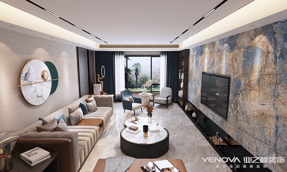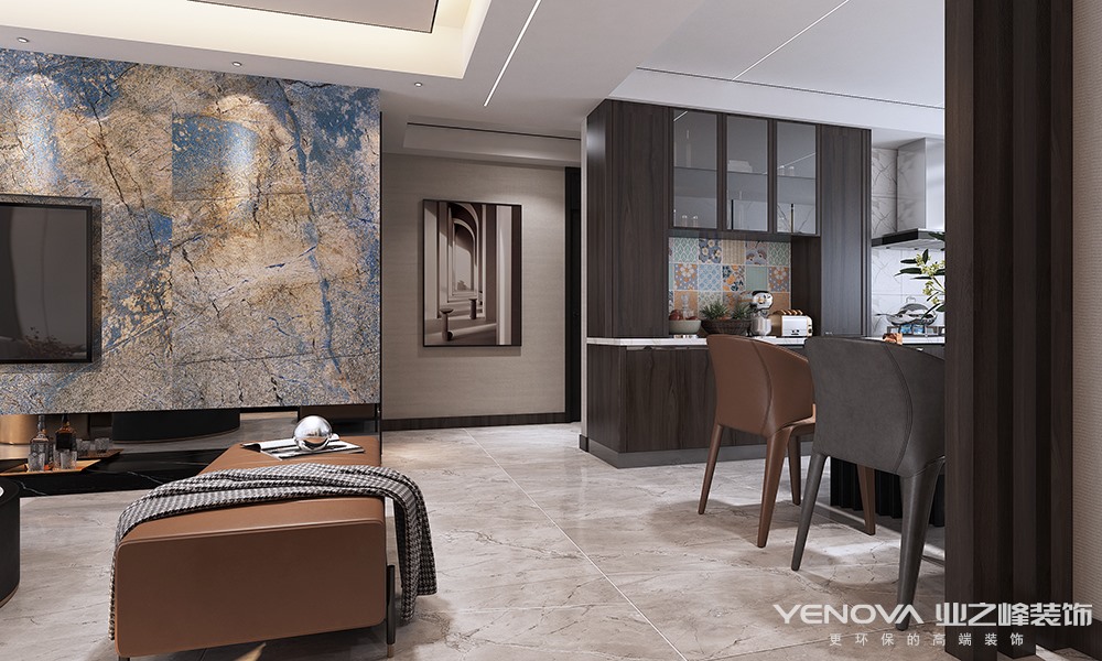 本案为无主灯设计,时尚大气,电视墙石材不同于以往的白色大理石,采用蓝色调,更加显示出年前业主的青春与活力。电视内嵌,将线路隐藏,化繁为简。餐厅的大板与厨房的墙砖为同色不同规格,即使遥相呼应,又是互相独立。很大程度上扩大了视觉空间效果。