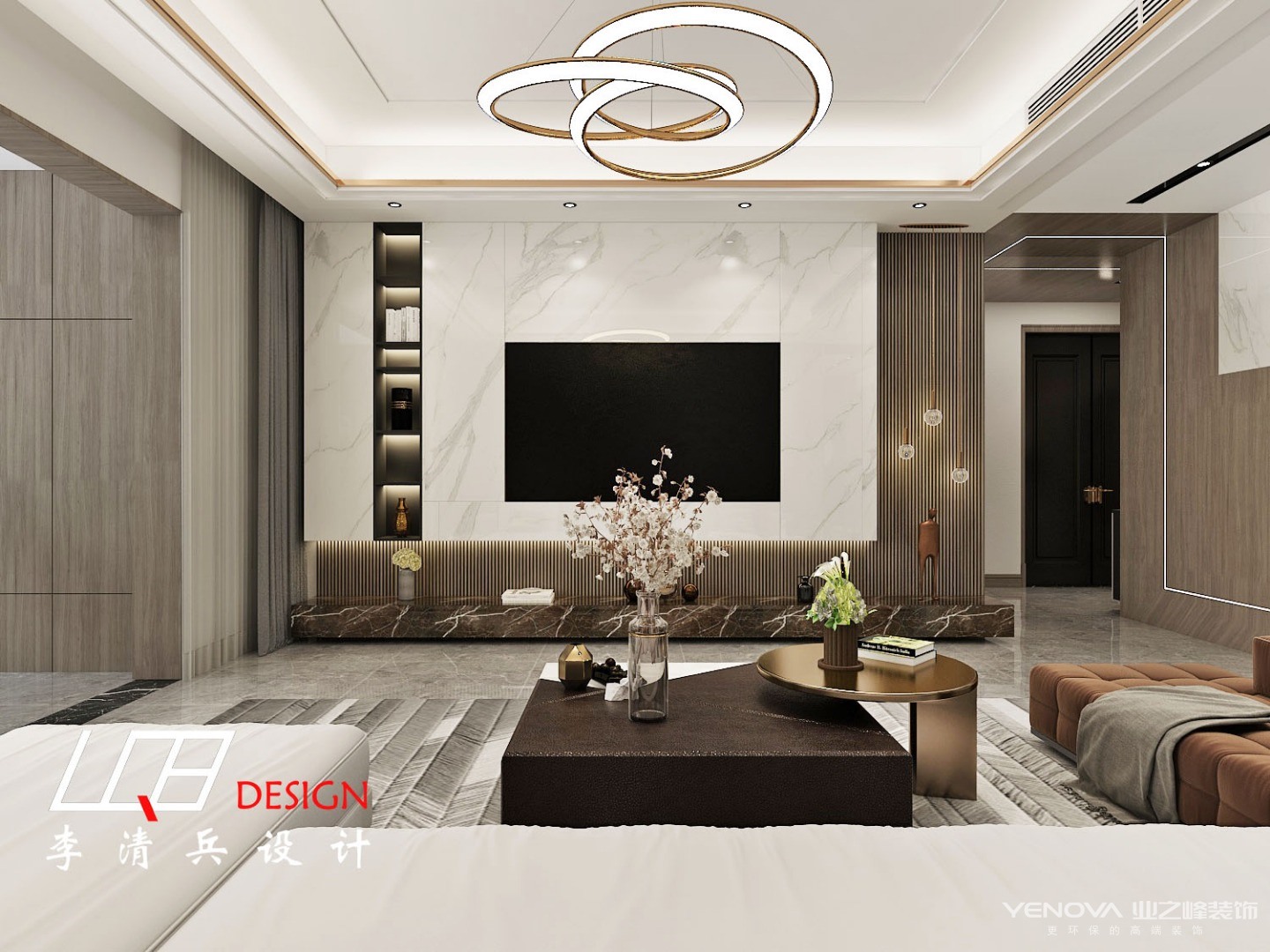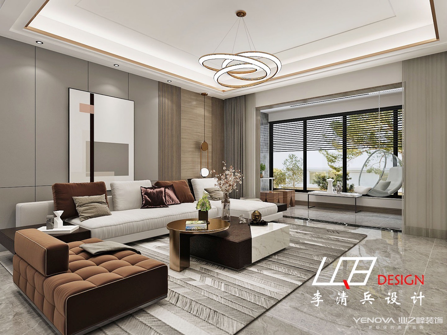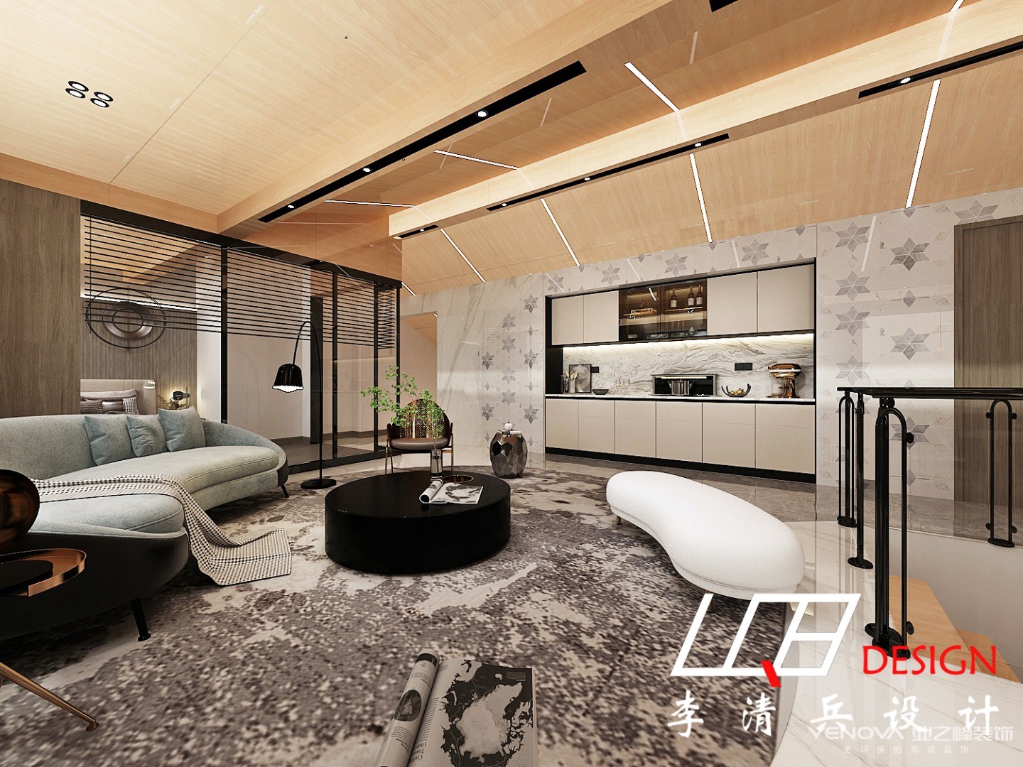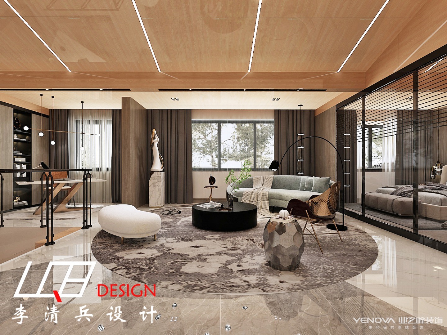 从上往下看也别有一番风味,水墨画的小茶几与地毯无缝拼接,几乎融为一体,整个客厅呈现出简约轻奢的画面。
