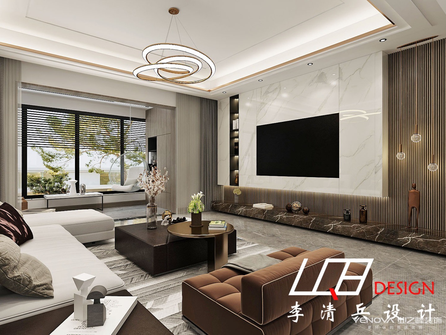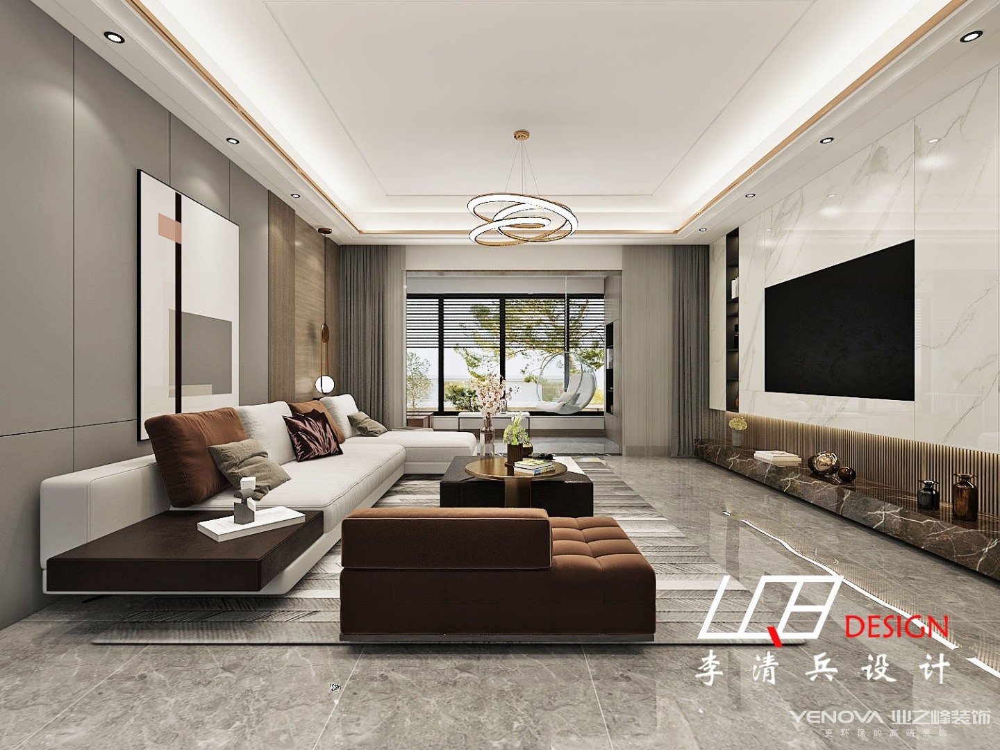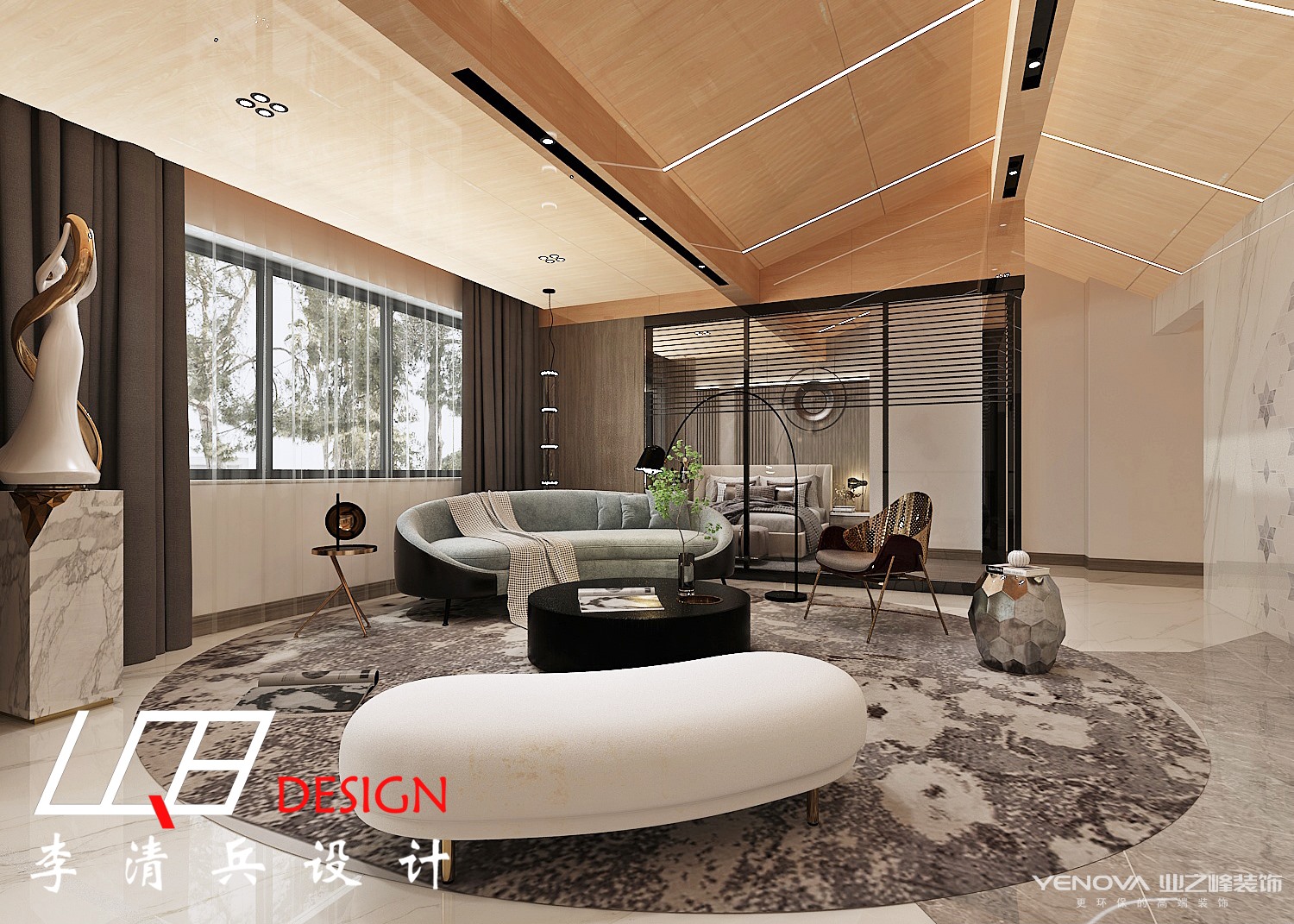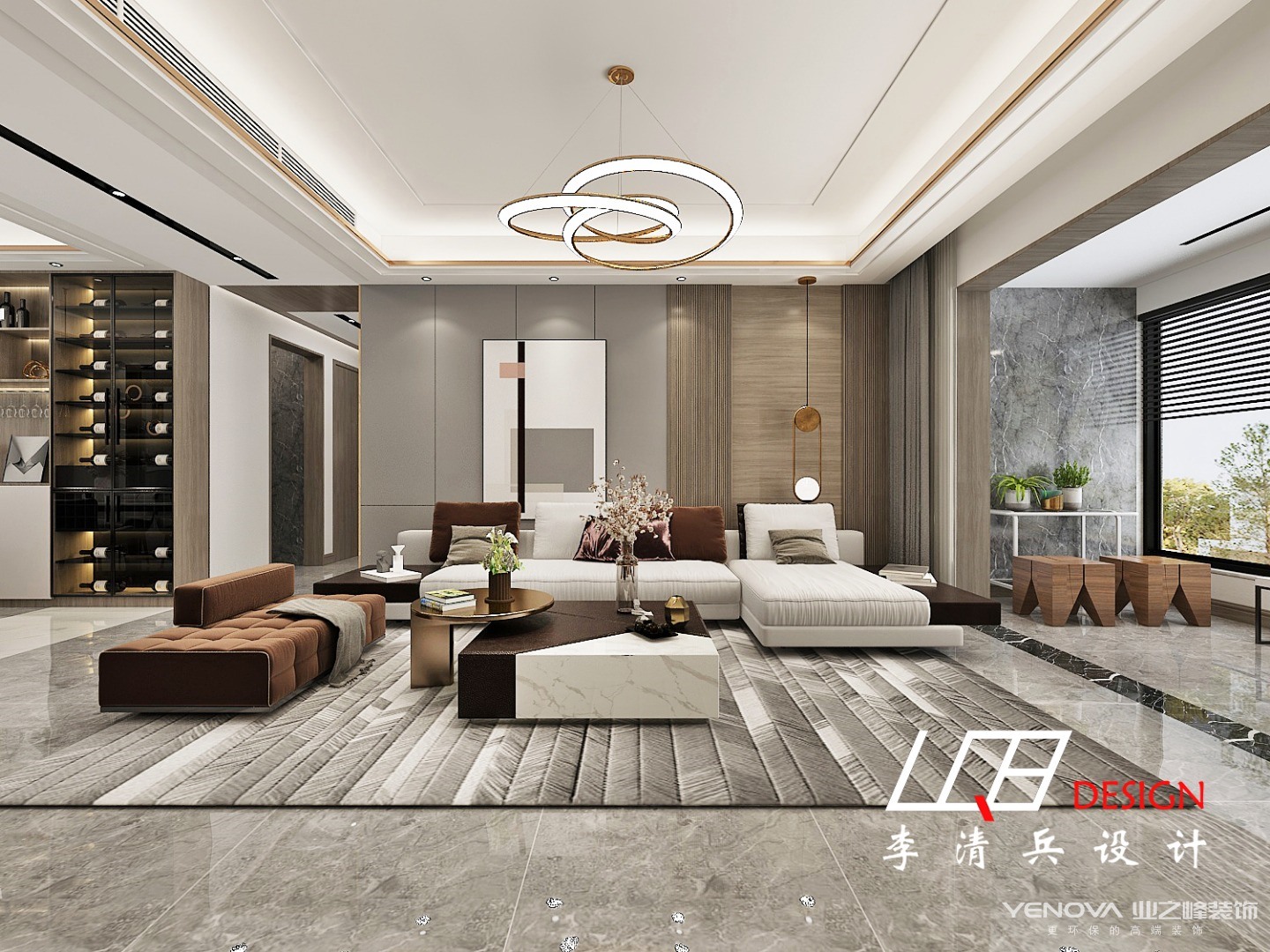 从上往下看也别有一番风味,水墨画的小茶几与地毯无缝拼接,几乎融为一体,整个客厅呈现出简约轻奢的画面。