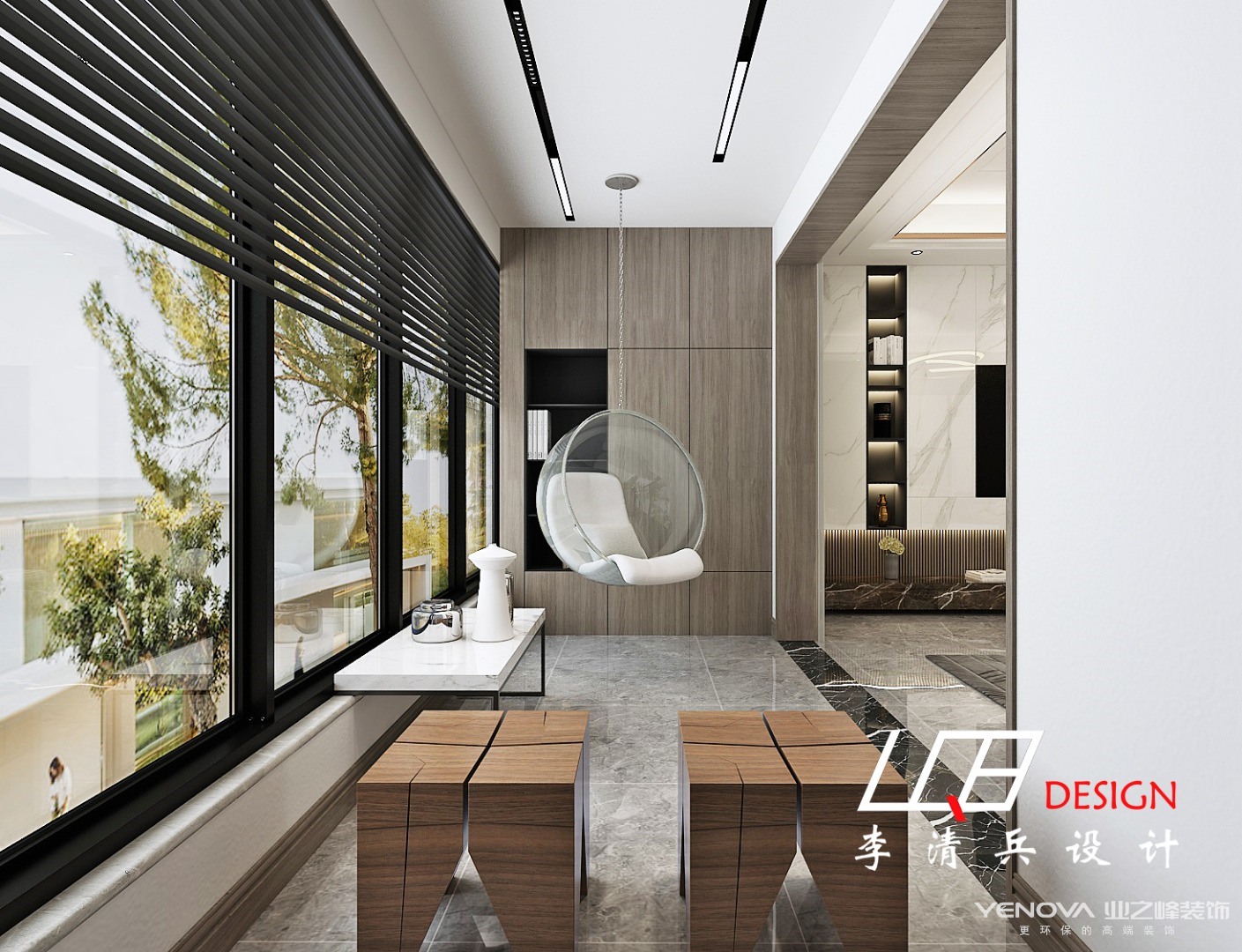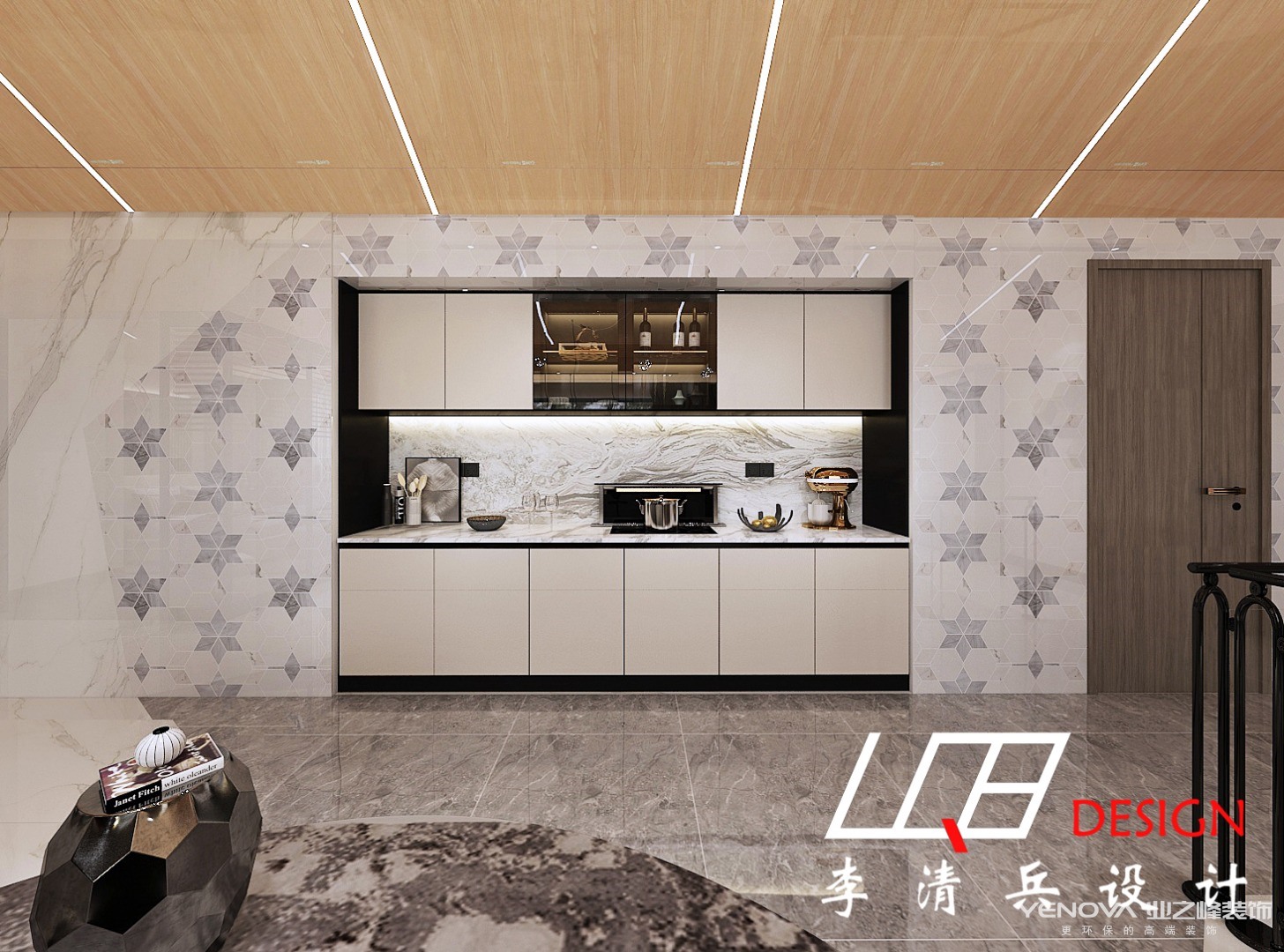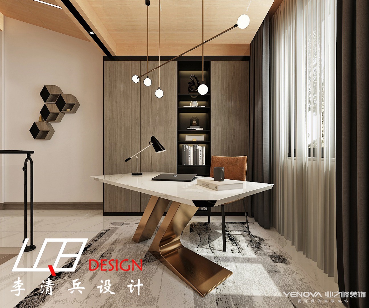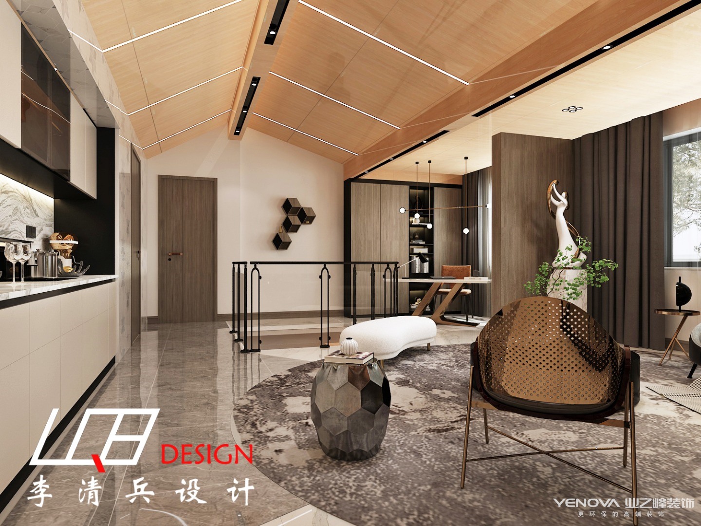 从上往下看也别有一番风味,水墨画的小茶几与地毯无缝拼接,几乎融为一体,整个客厅呈现出简约轻奢的画面。