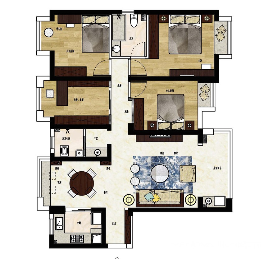 本案客户一家四口居家使用,要求保留三间卧室。利用进门的空间,放置鞋柜与老人房的衣柜,满足基本的生活需求。将厨房、餐厅和小的生活阳台做了拆改整合,扩大了餐厅的使用面积。将四室中的一间改为书房,打开了过道空间,增加了采光。整体格局,满足了客户的基本需求。