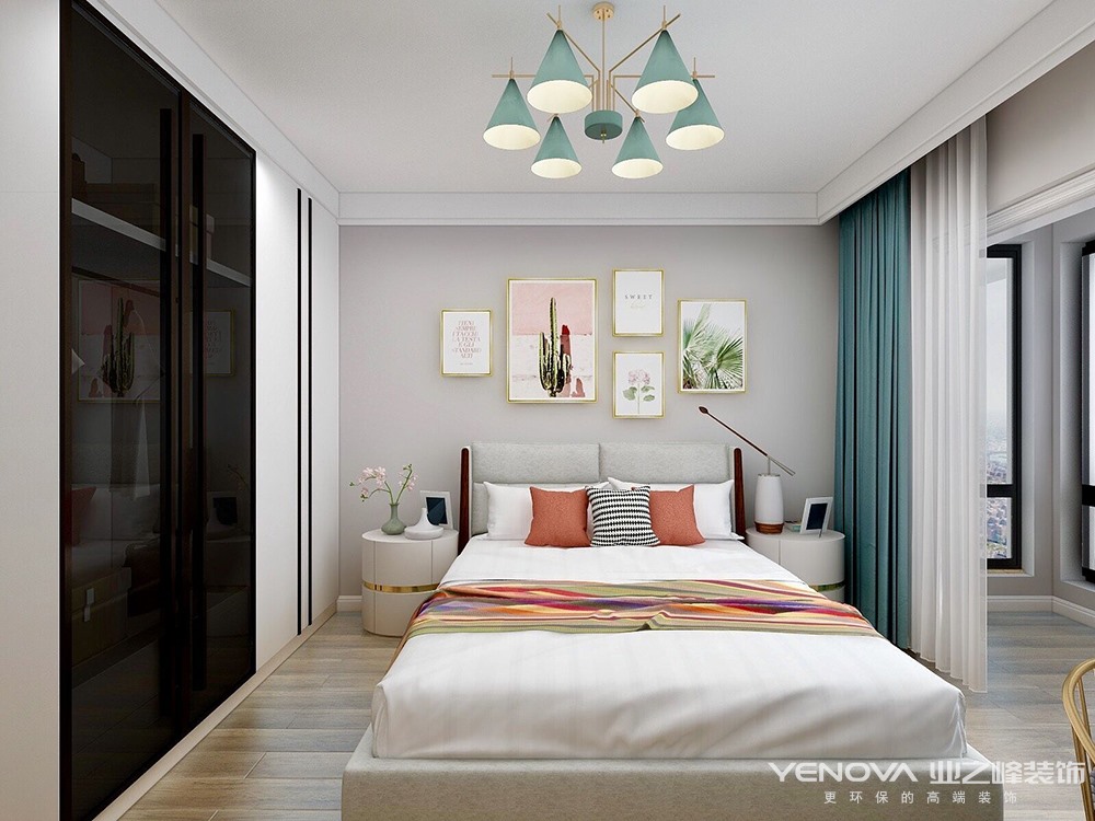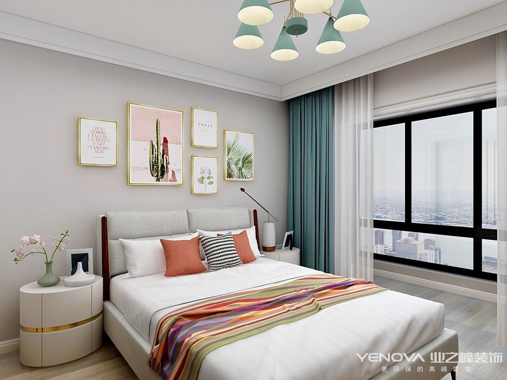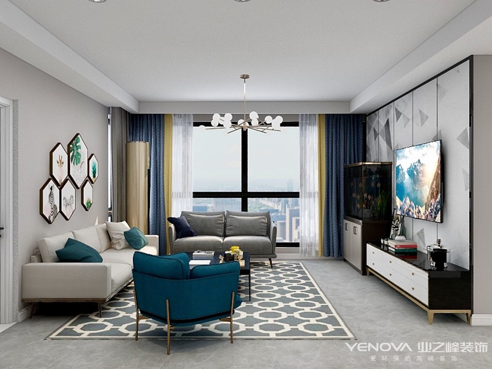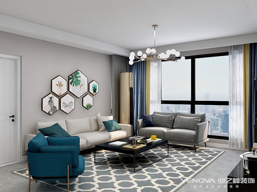 居室为三室两厅的西户,入户即为客厅,以西窗为主要光照,是整个空间里最出效果的部分。为保证充足的照明,在客厅采取局部边吊的吊顶造型,保证整体的居室高度和空间感,以便于自然光照的直接射入。墙面采用浅灰色打造高级质感,沙发采用科技布跳色材质,电视墙用定制壁画的造型镶以黑色金属边框,蓝色的窗帘和蓝色的单人沙发相呼应,层次感强的颜色搭配营造整体现代轻奢的品质感。