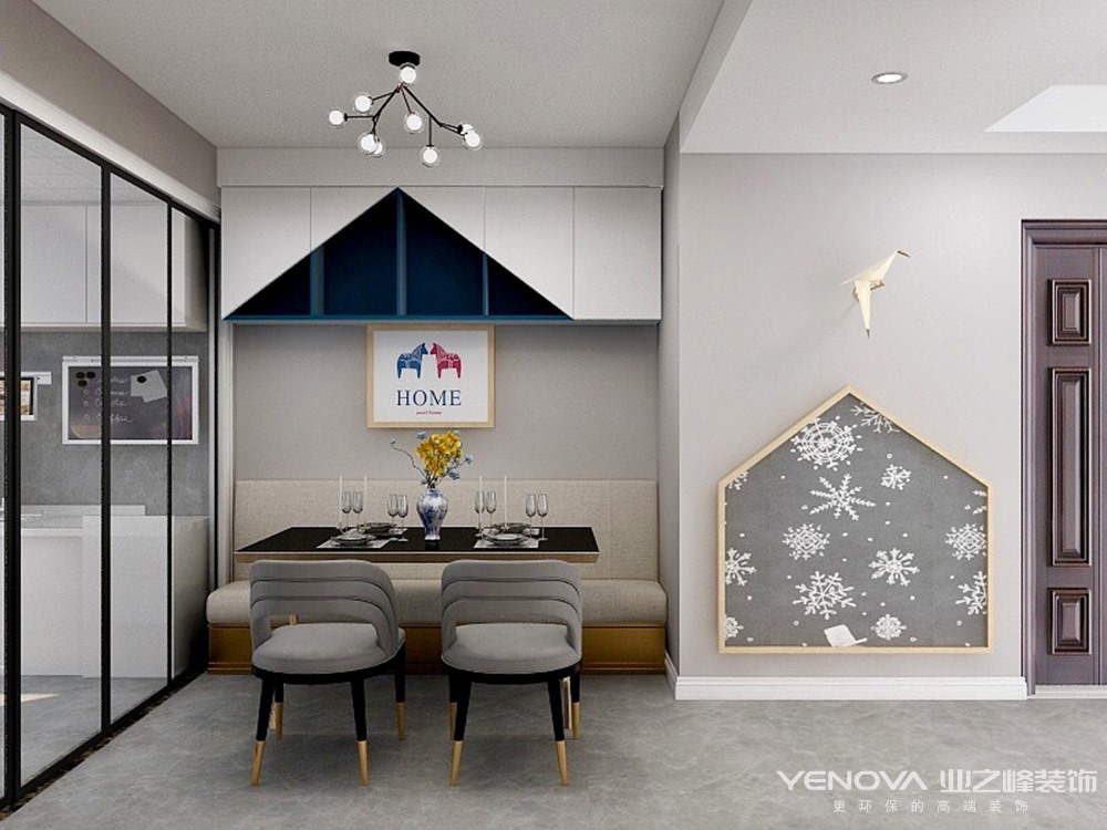 餐桌区域在厨房外的凹形区域内,光线以北窗与西窗的交叉区域,借用北墙设计卡座形式,以最少的空间占用设计用餐区域,打造舒适动线,引入更多北窗自然光线。