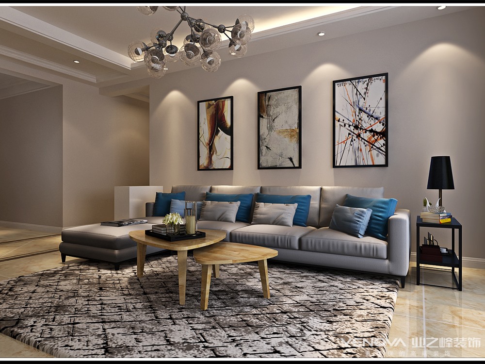现代简约风格设计说明通过家具、吊顶、地面材料、陈列品甚至光线的变化来表达不同功能空间的划分,而且这种划分又随着不同的时间段表现出灵活性、兼容性和流动性,