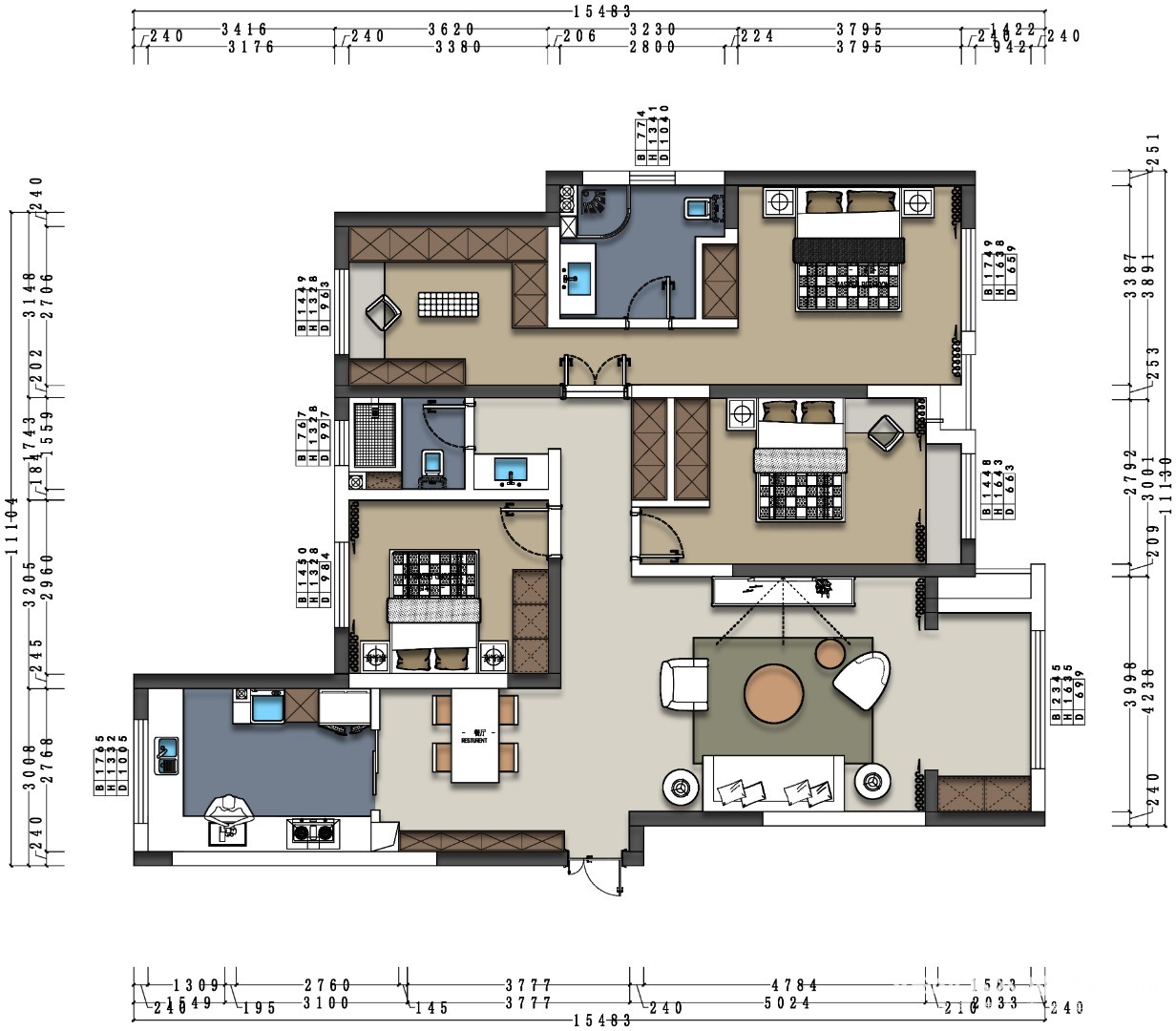 本案的户型是一个平层四居室,业主是一位年轻有为的青年,做为今后的婚房,在本案的方案上,我们为业主进行了非常大胆的设计,客餐厅的空间相对合理,将原本相对狭小的次卧,与主卧改为一个整体的大套间,考虑到年轻人的衣物较多,为业主打造了一个大的衣帽间并且使整个卧室空间南北通透,主卧的在原本的走廊上,做一个大的双开门,使起更显高端大气。原来的小衣帽间拆除后,做为儿童房的空间,背靠背的衣帽柜,使功能上更为合理。