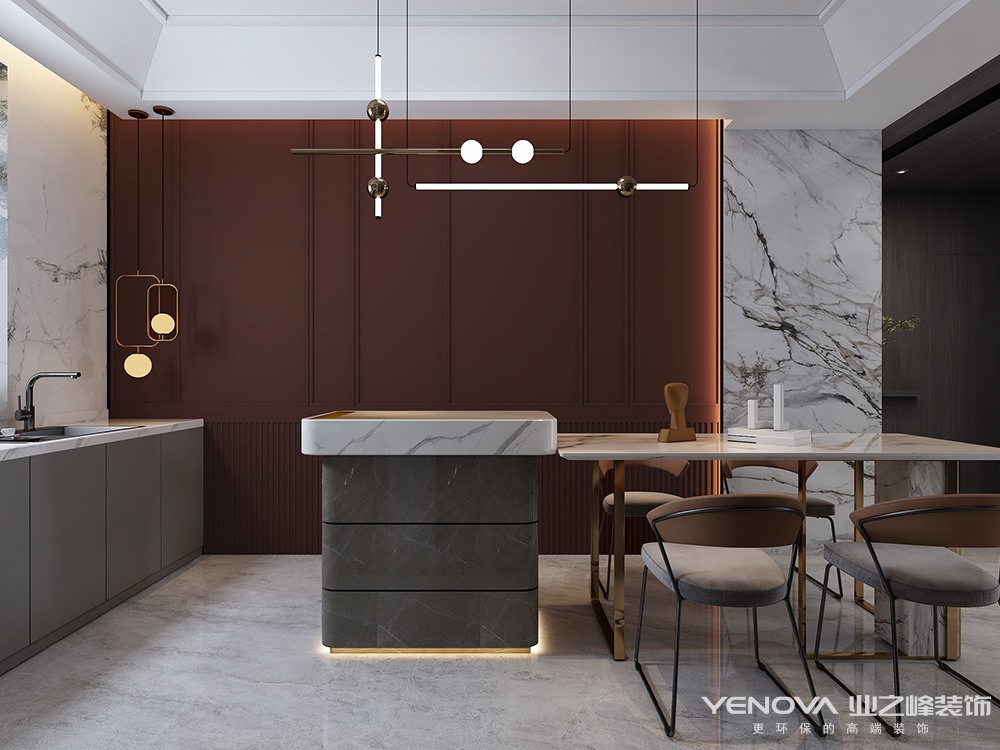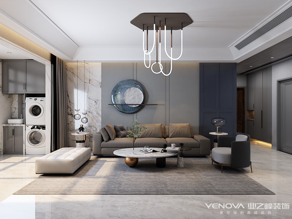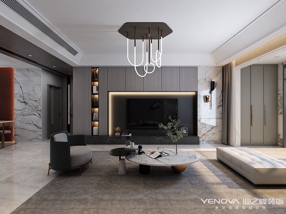 本案设计师在与业主沟通后,整体根据业主之前得一些生活习惯以及生活阅历,呈现出整体得低奢风格,用石材于墙板得局部结合,以及深色搭配,让整体得色调沉稳又富有质感。