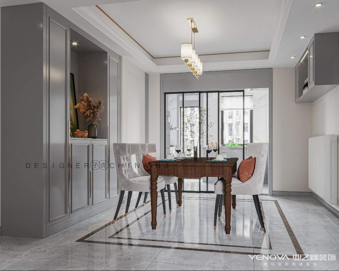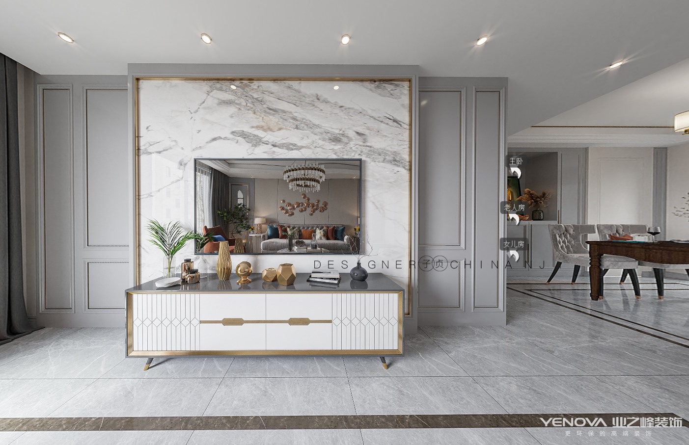 着力打造一种轻奢金属与护墙板与浅灰色色系轻奢的氛围。