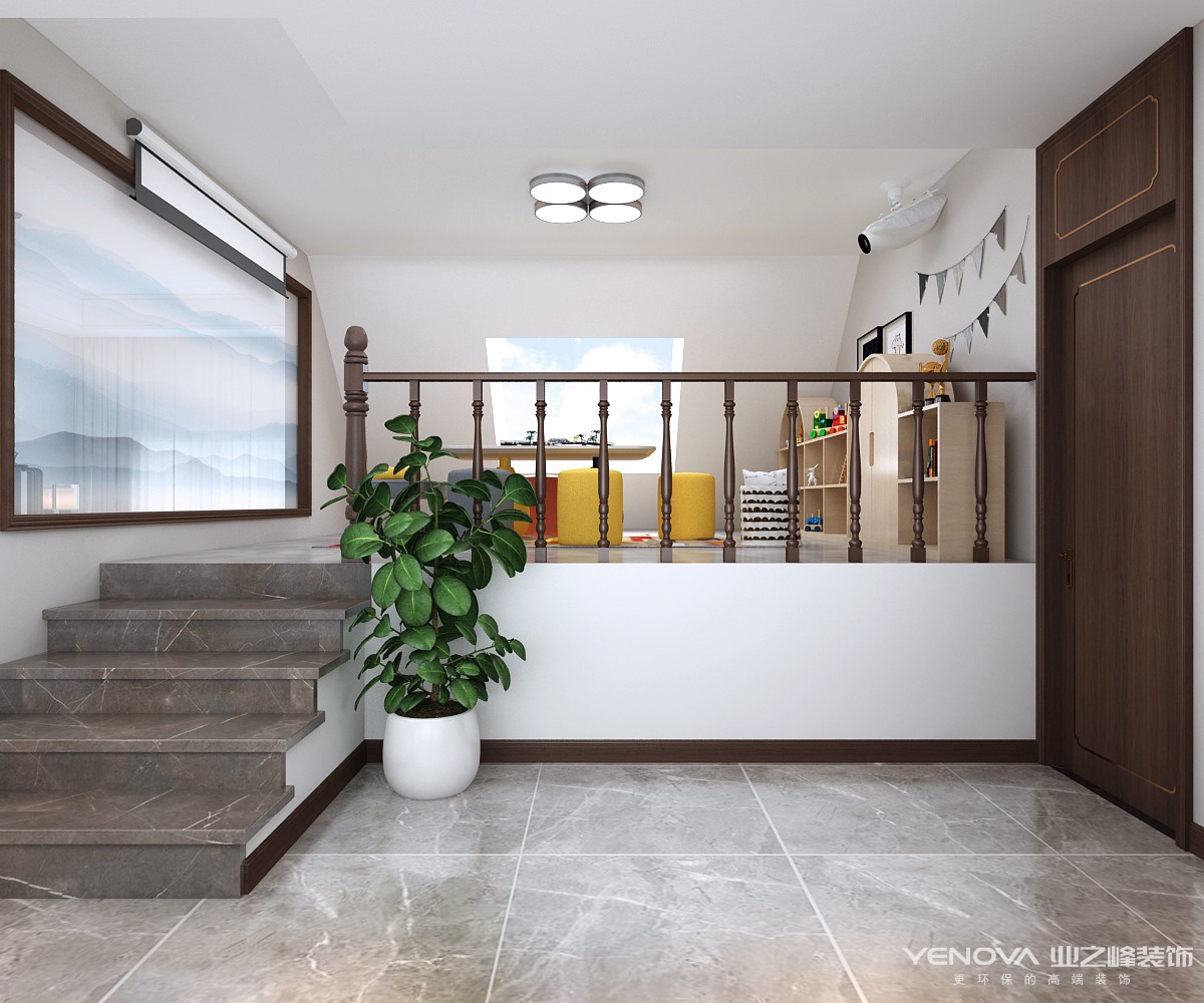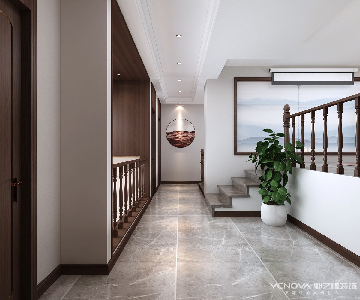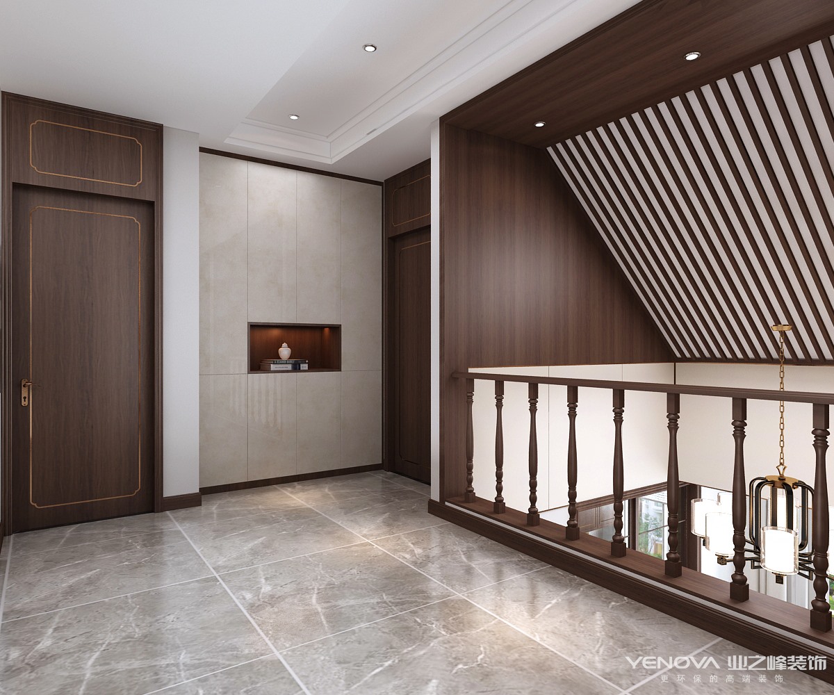 本案例为顶层复式结构,经过巧妙设计合计运用,新建隔层增加使用面积。新中式风格讲究对称,沙发背景墙和电视墙做了对称处理,生动灵活,顶面选用木制品与发光灯槽的设计。灯光的衬托,让整个空间感觉雍容大气,华贵和谐。