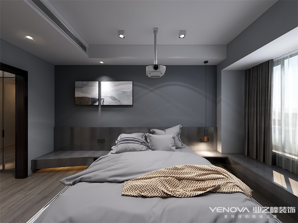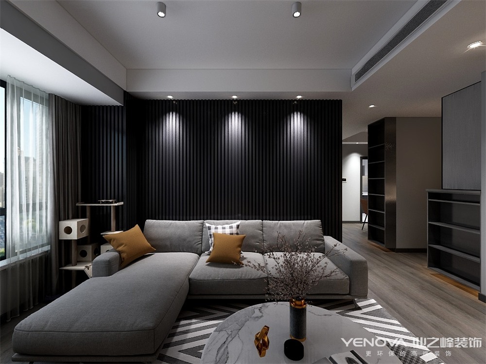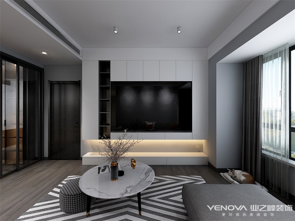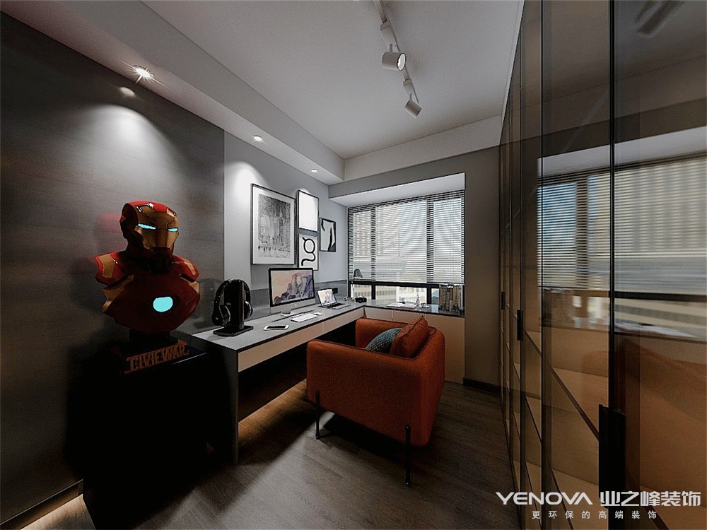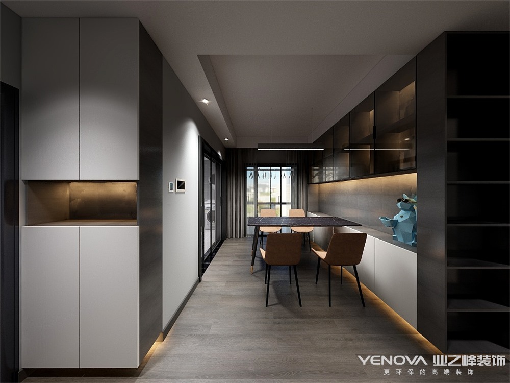 本案业主是位游戏公司职员,二次元爱好者收藏多,因此整体采用了现代风格,抛弃多余的装饰,以极简的装饰风格及大量的深色玻璃柜门来增加储物空间并突出各类收藏品的展示,独立的书房满足业主办公及娱乐需求,主卧与衣帽间打通形成套房,整体以黑白灰冷色调为主,同时用灯光的线条营造出科技感,凸显出了业主作为都市新贵的气质。