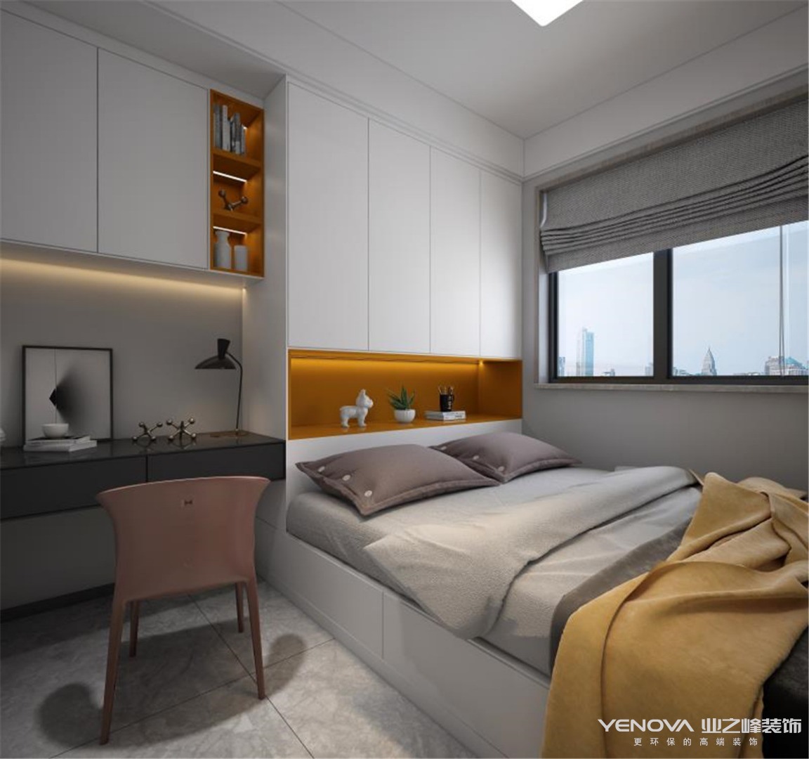 次卧:榻榻米房即作为客房也作为书房,木作设计都比较简洁,巧妙的使用黑白灰,可以达到简洁时尚现代的效果。棕橘色的加入为整体空间注入了温暖和安心。