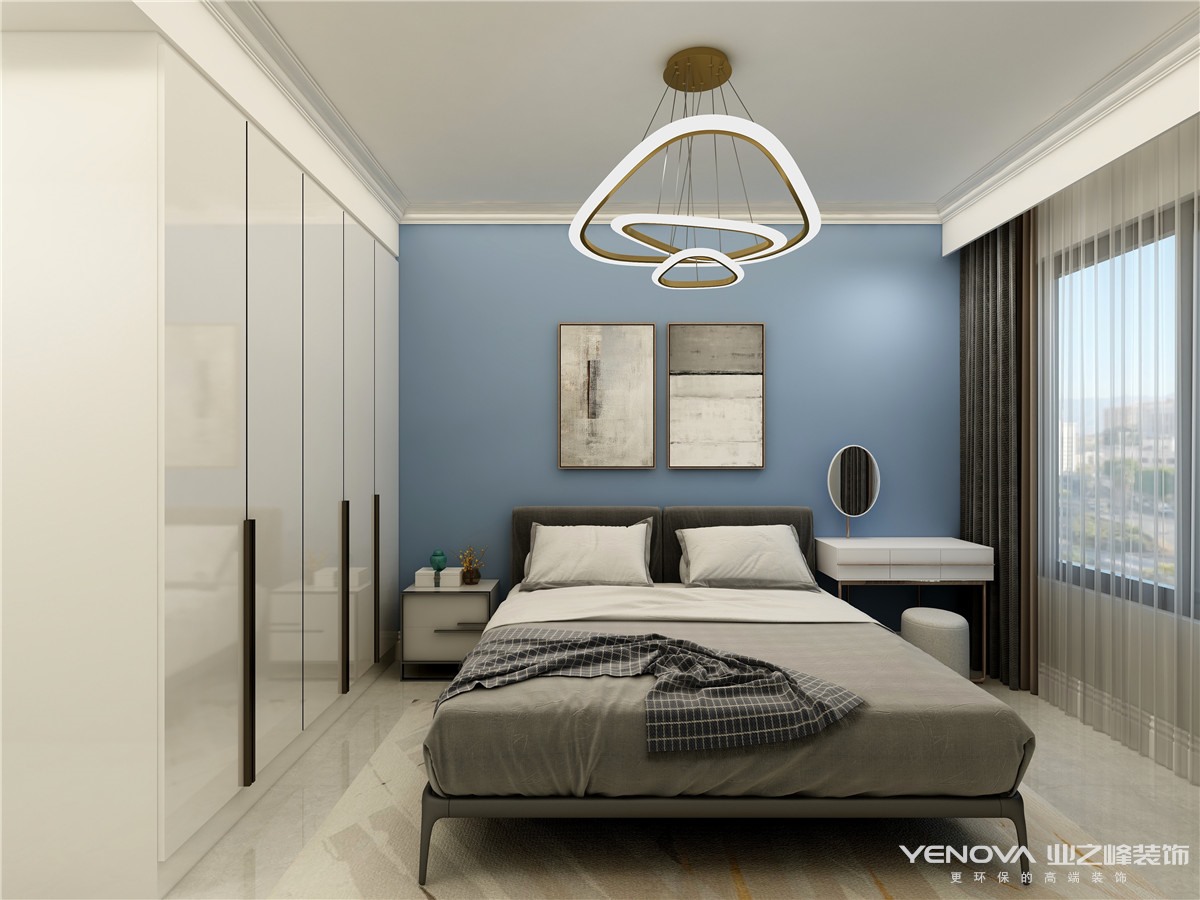 主卧:家具的选择上采用了中性灰,搭配亮白色的床品,天蓝色背景墙上穿插的黑白挂画,时尚中多加了一份优雅。