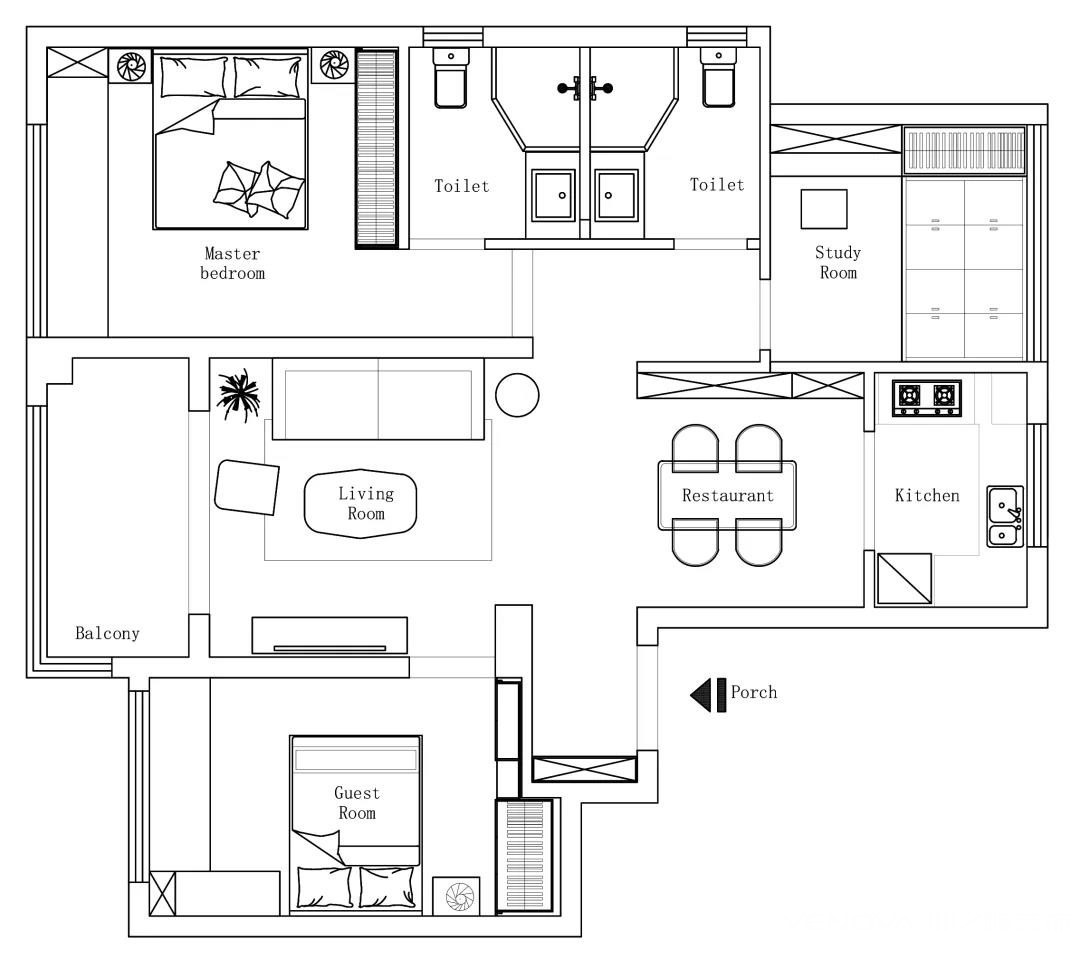业主做为一个退休老人,所以本案的设计以港湾为主题,进行深化,每个细节的处理,都为了能给客户一个更为温暖的环境。灯光的辅助效果更为整体空间的温馨指数提升了不少。当然客户的生活指数也会提升。 业主做为军人,为祖国戎马一生,正所谓“人是漂泊的船,家是温暖的岸”。 户型南北通透性较好,没有过多的空间浪费,2.75米的房屋高度也比较适合做造型吊顶,客厅的电视墙与沙发墙的长度接近,使客厅更为方正。门厅与过道相连,但长度过长,门厅应该独立出来。厨房与餐厅相邻,用餐与烹饪更为方便。主卧阳台后期可以做为晾晒区