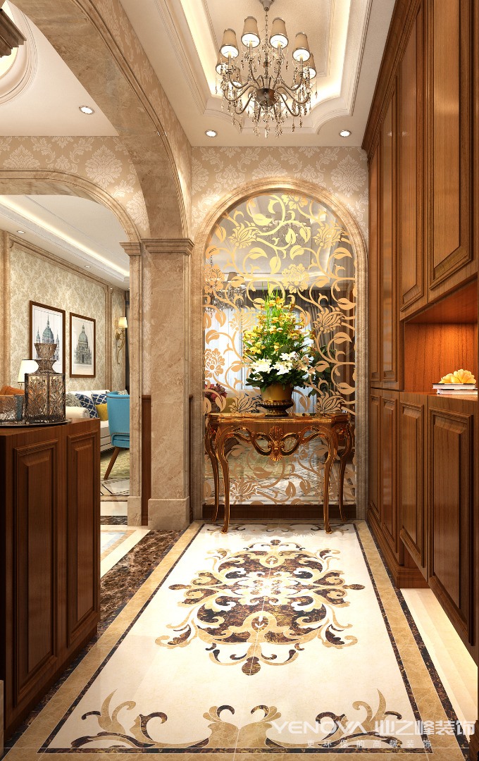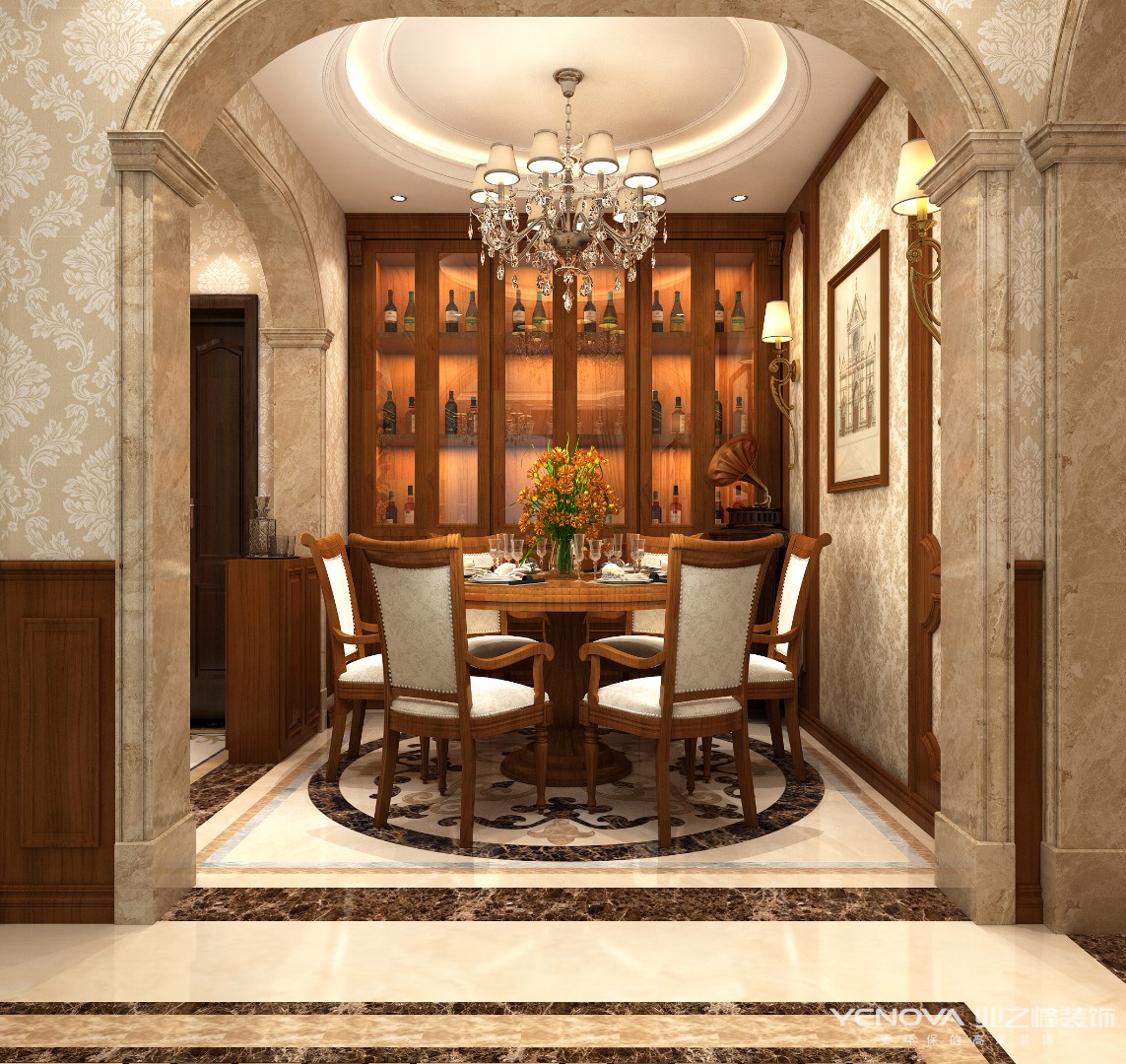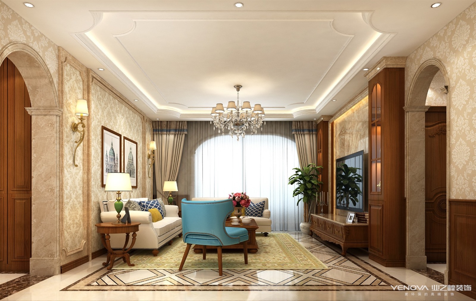金黄色和棕色的配饰衬托出古典家具的高贵与优雅,赋予古典美感的窗帘和地毯、造型古朴的吊灯使整个空间看起来赋予韵律感且大方典雅,柔和的浅色花艺为整个空间带来了柔美的气质,给人以开放、宽容的非凡气度,让人丝毫不显局促。壁炉作为居室中心,是这种风格最明显的特征,因此常被广州室内装修广泛应用。