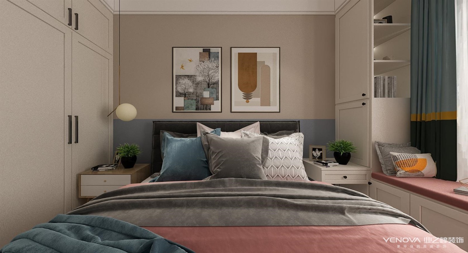 主卧:为了使整体风格的协调性更好顶面做了一个简单的直线吊顶,因为卧室面积不是很大所以并没有加灯池,里面做一个石膏线交圈,地面原木色地板与客厅一致,卧室是私密空间,为了增加卧室的温馨氛围在墙漆里微微调了一些暖色进去,加以装饰画点缀。