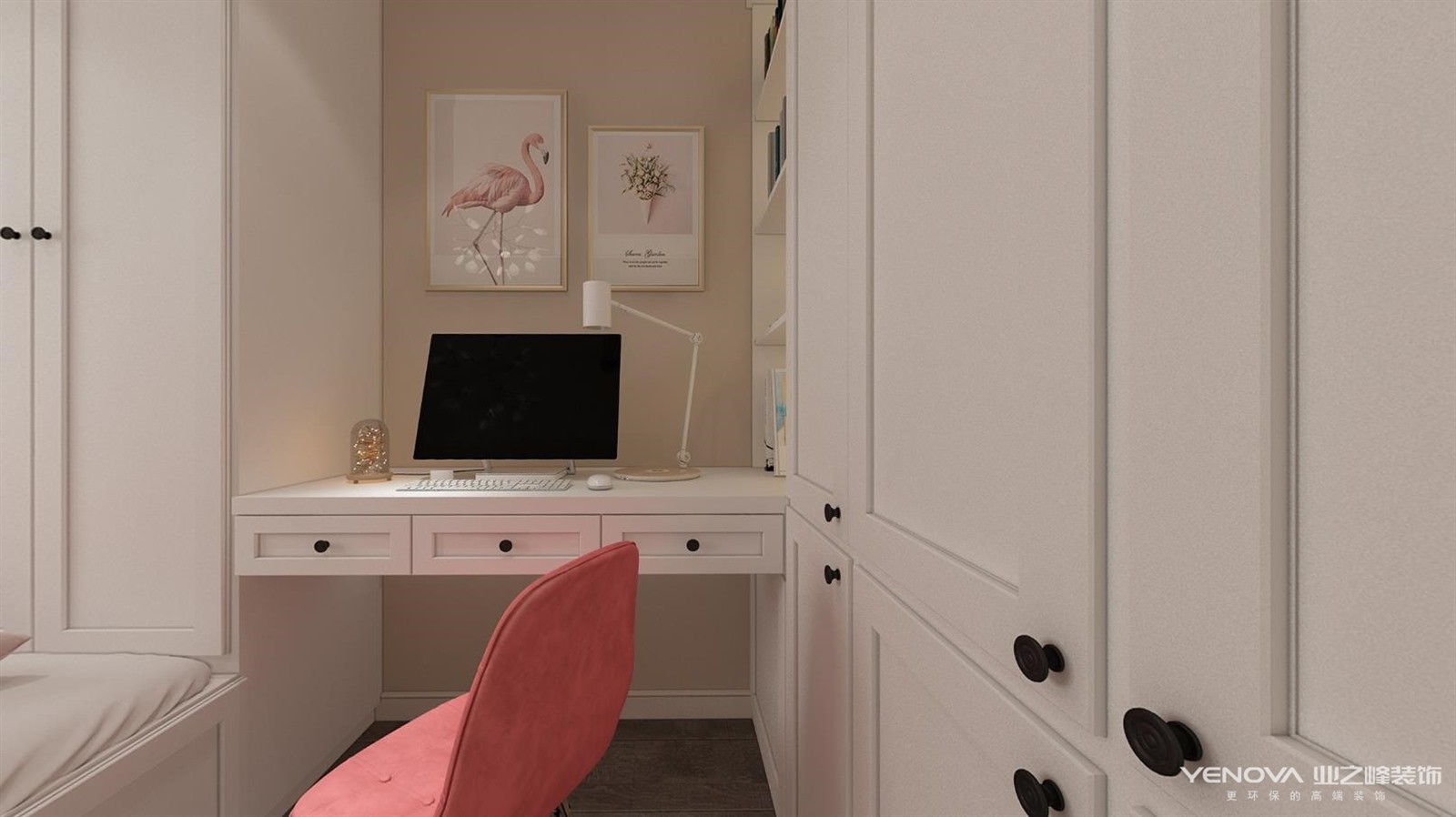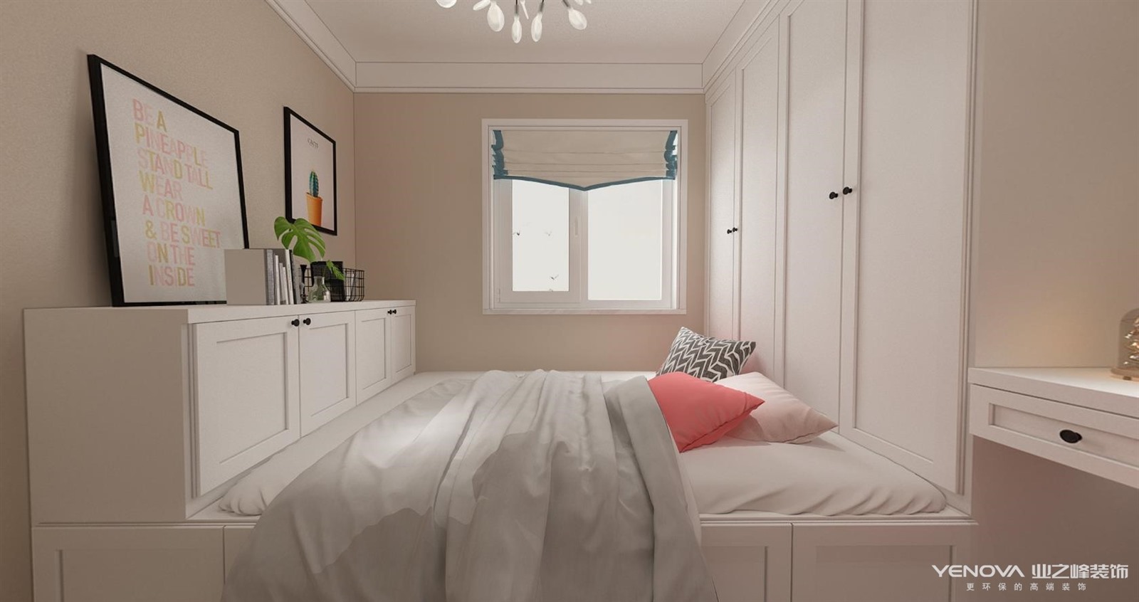 次卧:次卧因为是主要给孩子居住,做了整体榻榻米,考虑收纳功能。所以在颜色上和主卧室稍稍加以区分,顶面用简单的石膏线装饰,床头背景墙做了一面浅灰色区分与其他墙面,并加以挂画点缀,地面浅色系的地板配上白色的衣柜亮度大大提升。整体风格统一,简单不失大气。