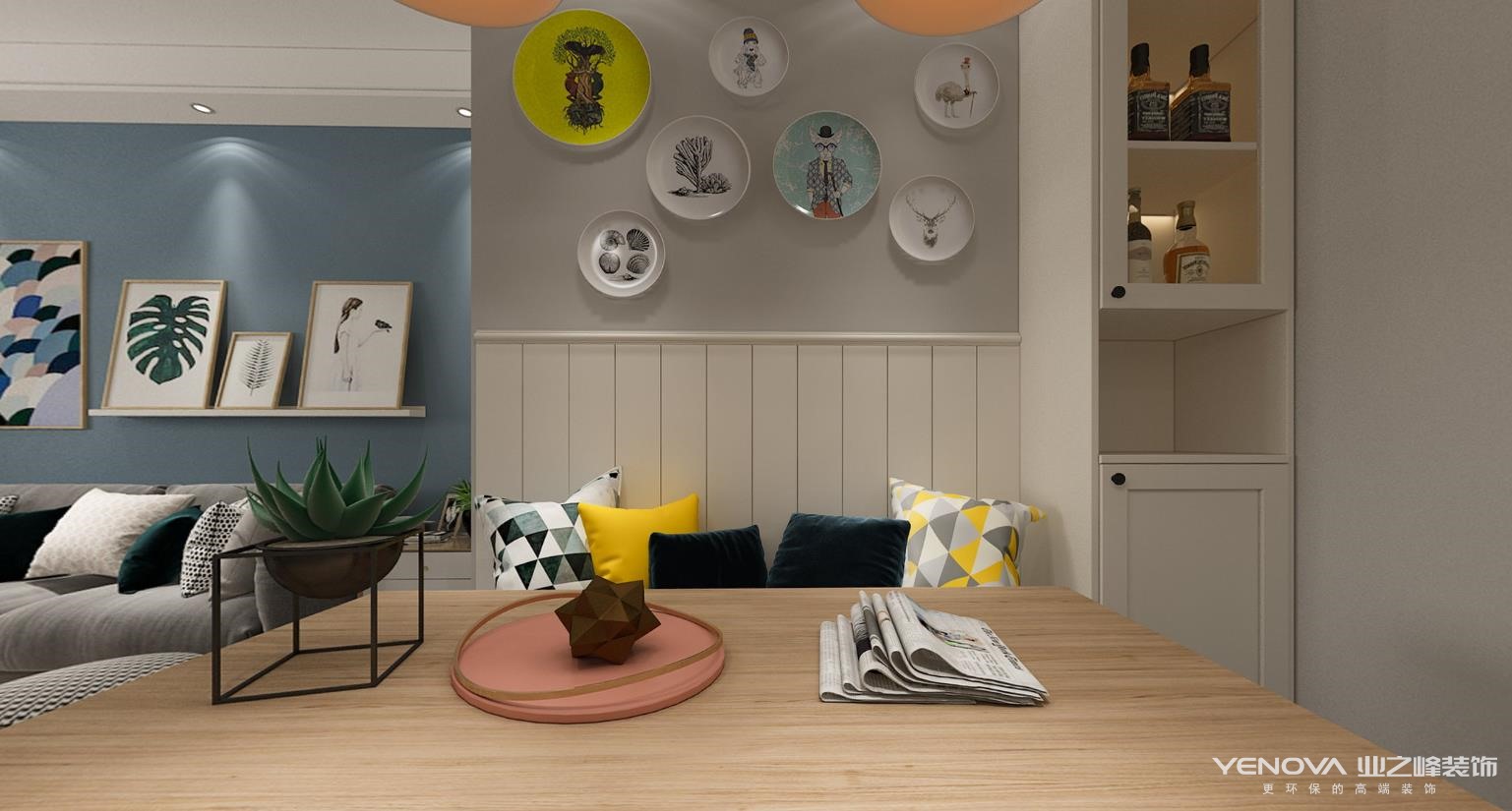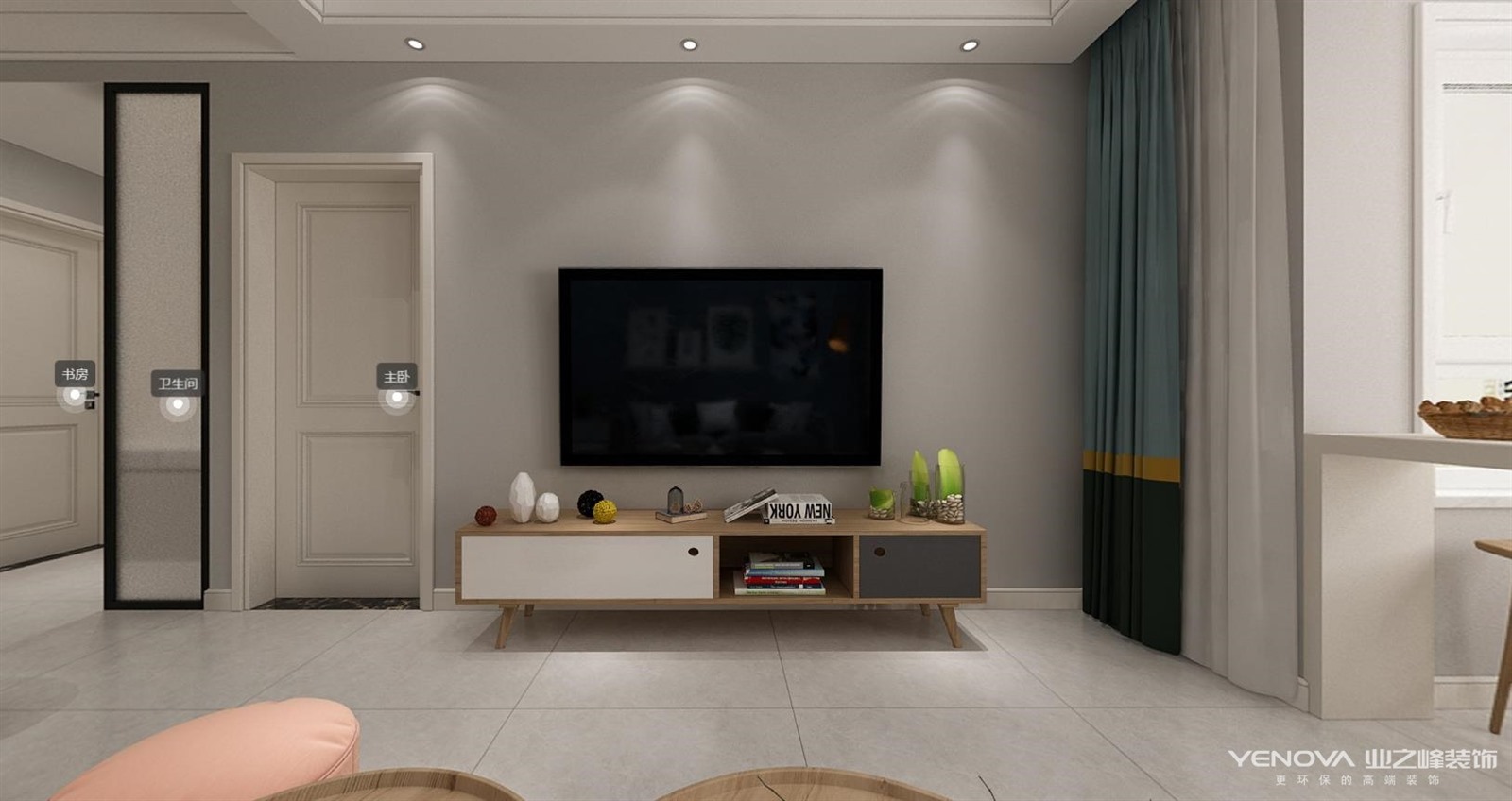 此户型是一个两居室户型,根据与业主的沟通交流,决定决定将本案定为北欧风格,要简单明快,客餐厅:因为户型没有独立的餐厅区域,所以客餐厅现在是一体化,把餐桌放在了靠近电视背景墙的位置,为了不阻碍活动动线,客餐厅整体一体化的造型顶,不需要做区域划分,电视背景墙使用了石膏线与墙漆调色的结合,即节约成本也出效果,并且增加环保系数,地面使用的是原木色地板,这样空间色调不会过于暗,因为入户门正对着卫生间门且是承重墙无法调整,所以在电视背景墙旁加了一组玄关架,也可以当书架来使用。