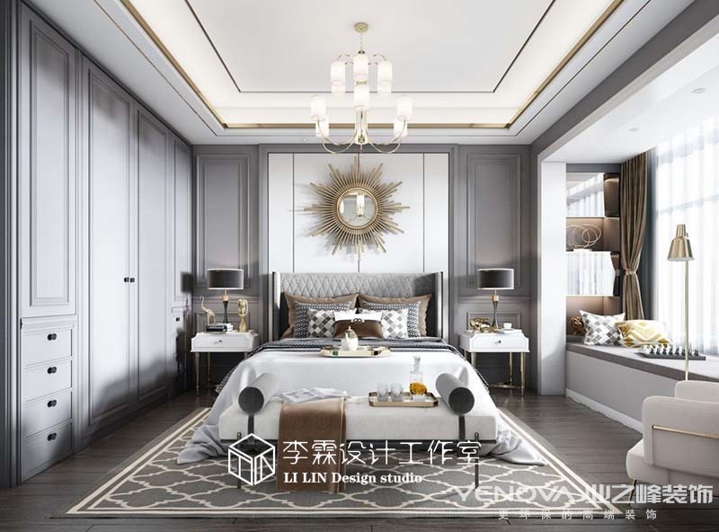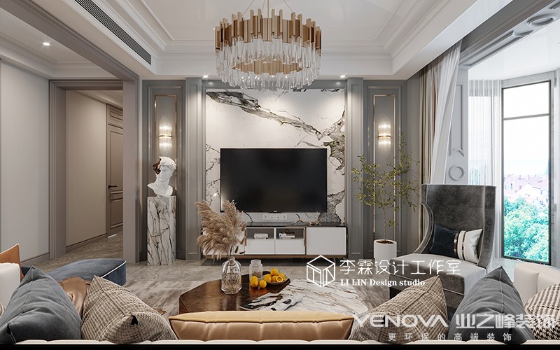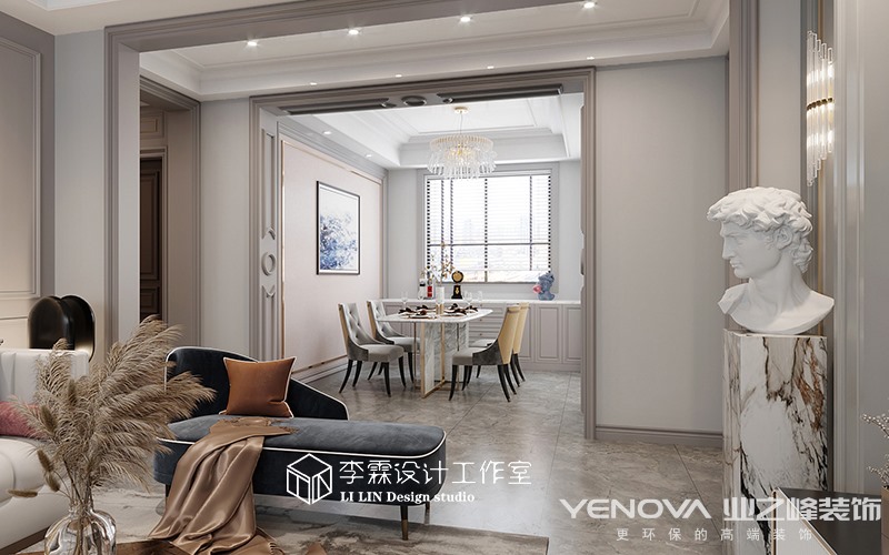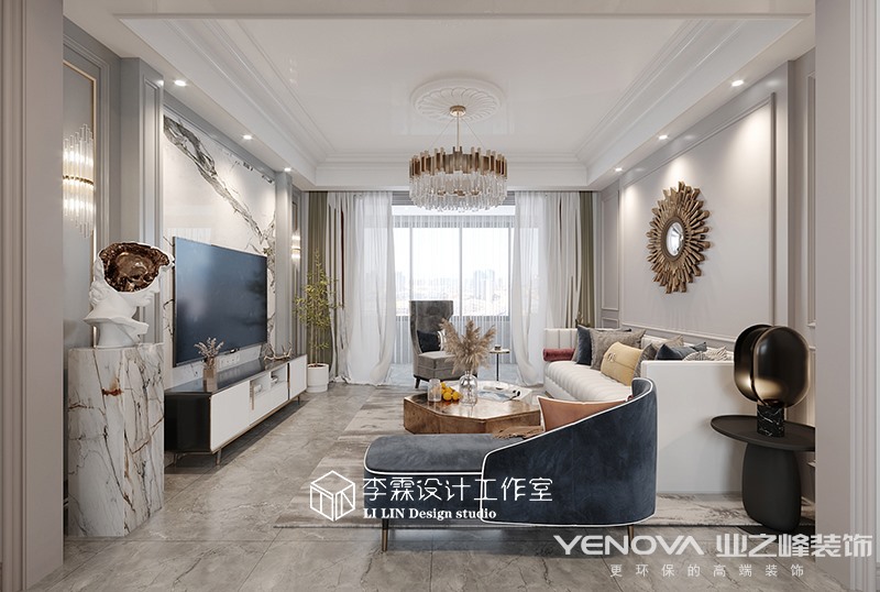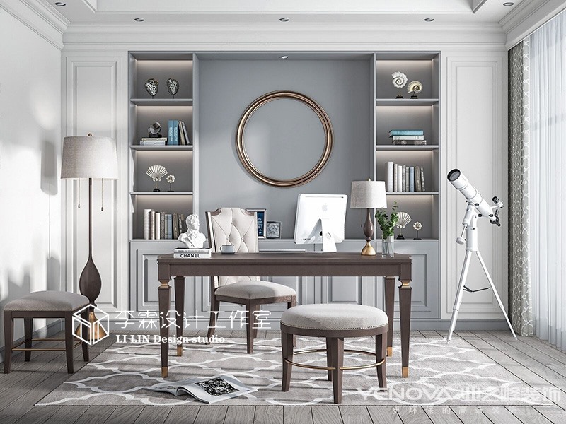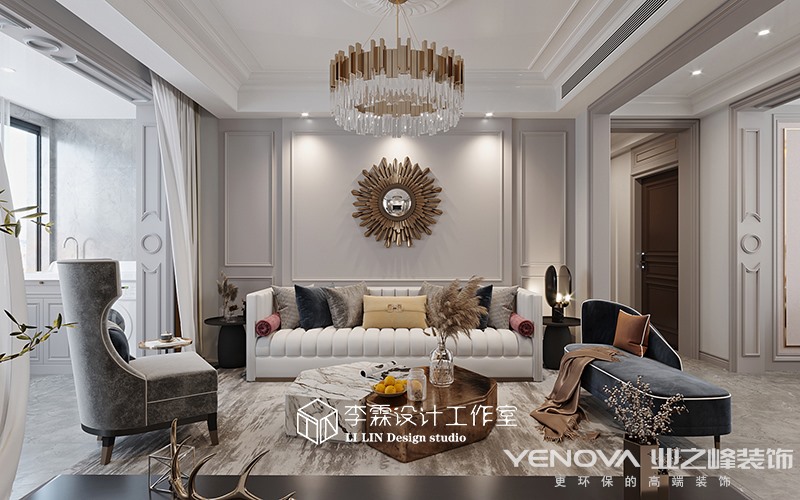 本案位于济南尊,建筑面积152平米,设计风格定位美式轻奢,灰色的客厅,优雅有档次,简约的线条,优雅的氛围,营造出自由舒适的家具氛围,灰蓝色的家具使空间更具低调奢华优雅,和灰蓝色的墙板相呼应,跳色的软装使空间活泼起来,具有年轻氛围和沉稳优雅美式轻奢,不论哪个年龄段都会被他吸引。