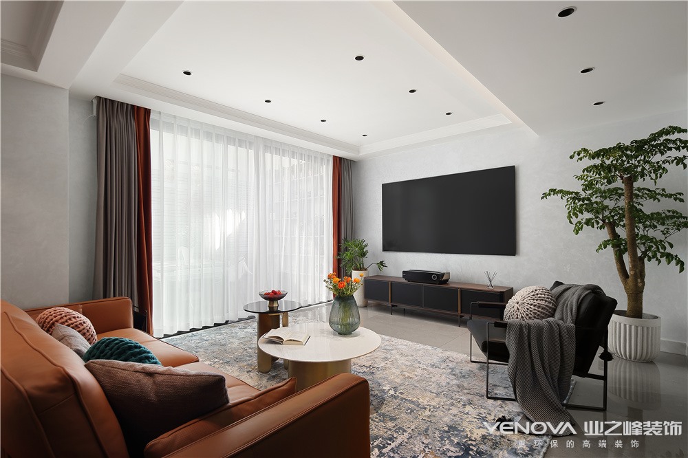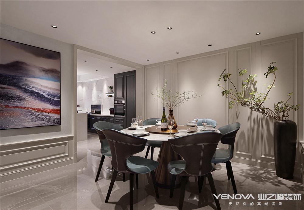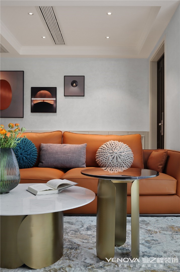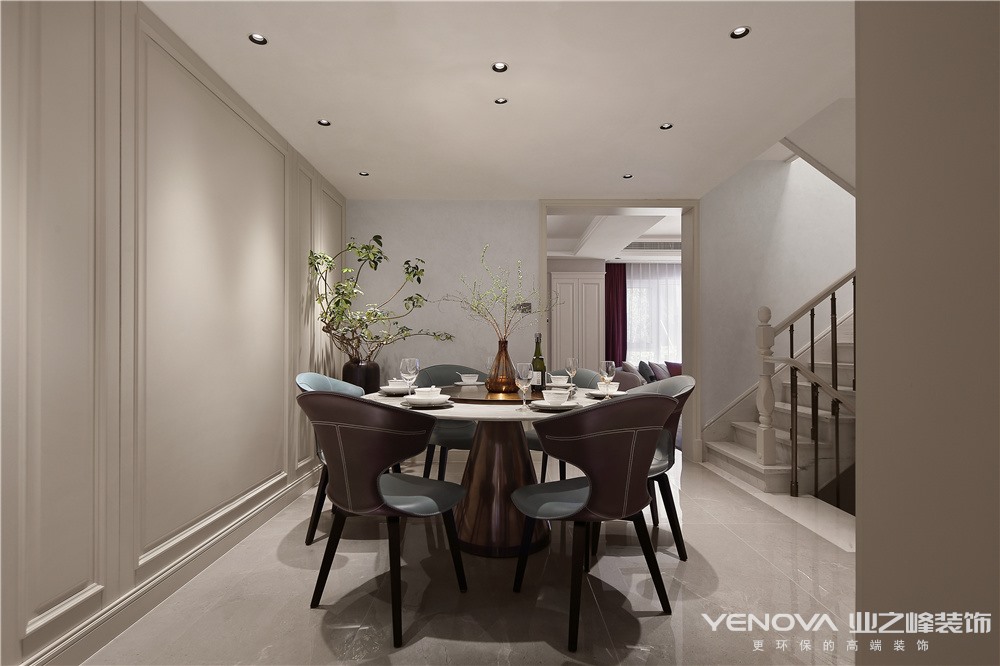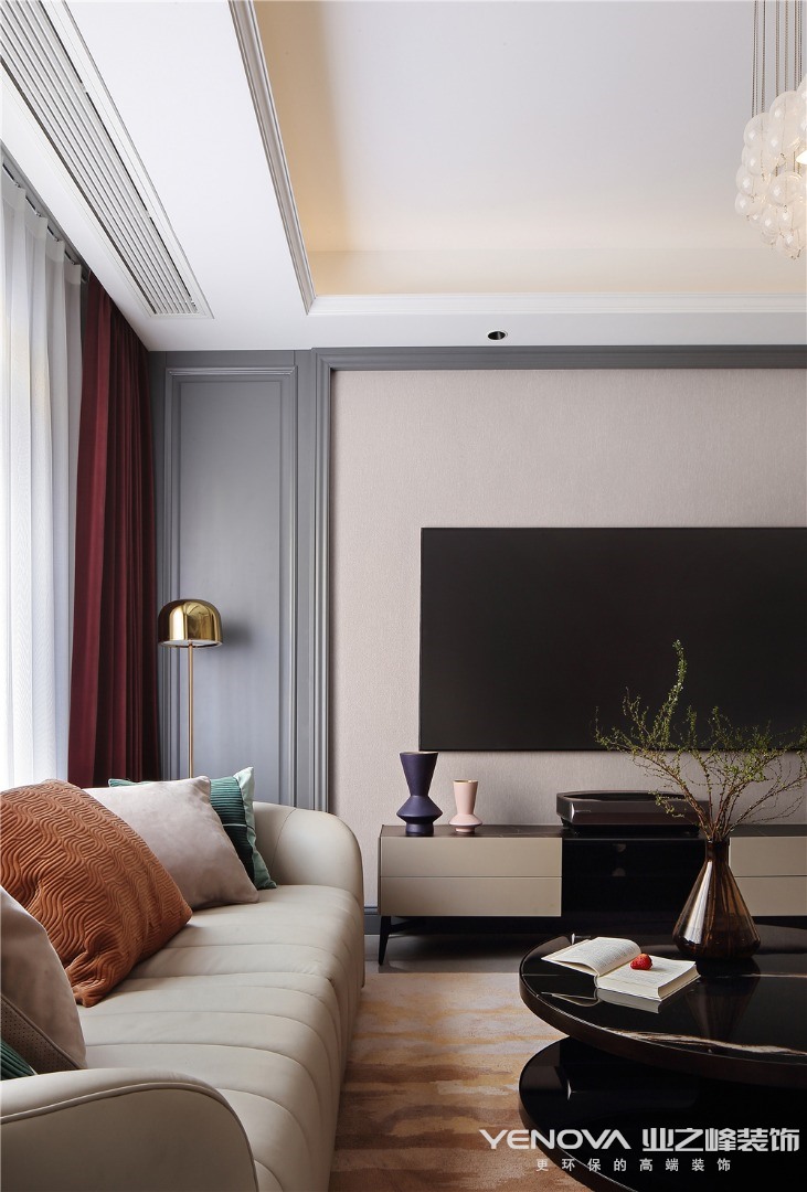 客厅延续了门厅的整体色调,在形式感上已高矮护墙互相搭配,增加层次感。其次,不同于传统客厅得摆放,采用了三人位跟一对沙发面对面的摆放,从设计手法上增加了家人朋友沟通感情的时间,让家更有爱。