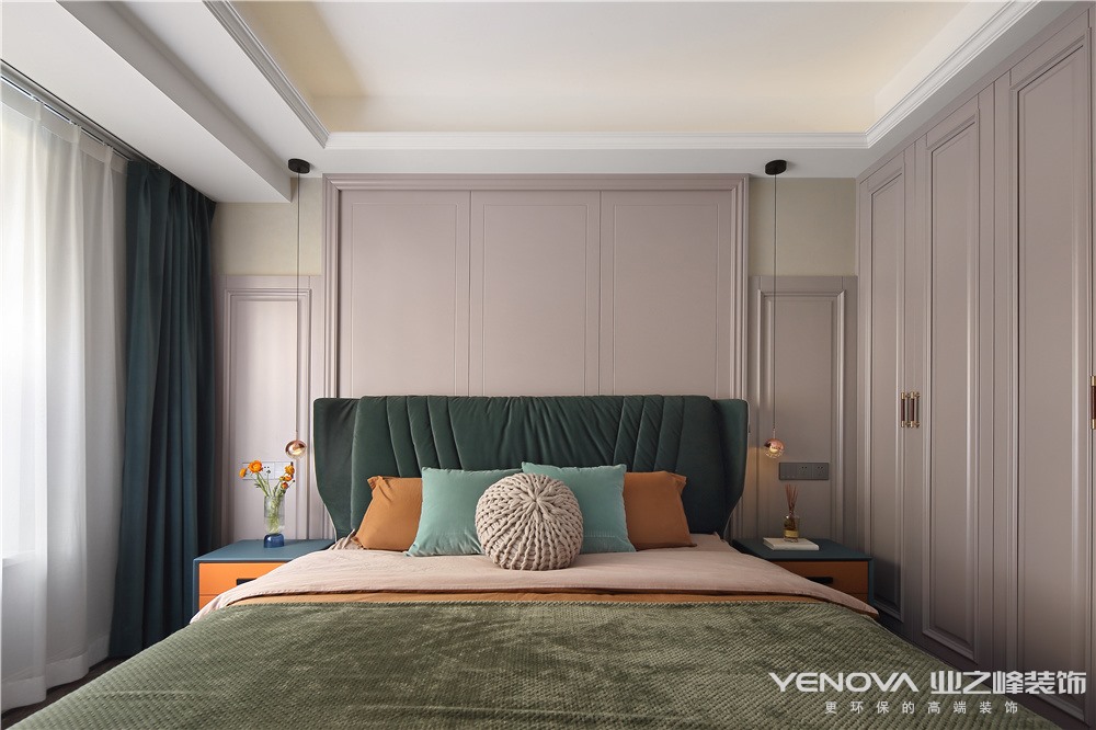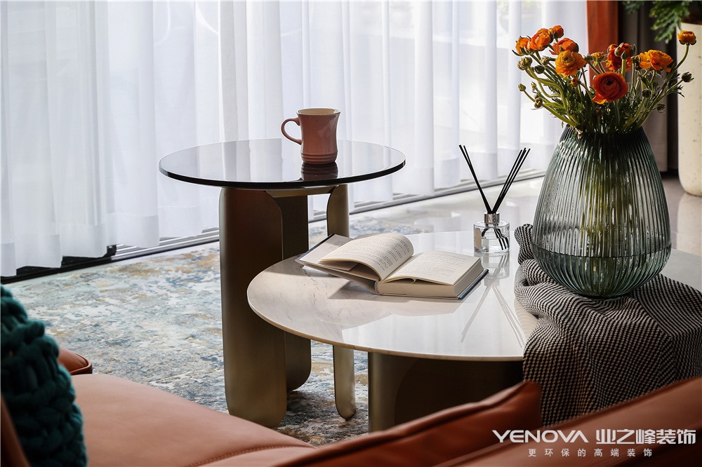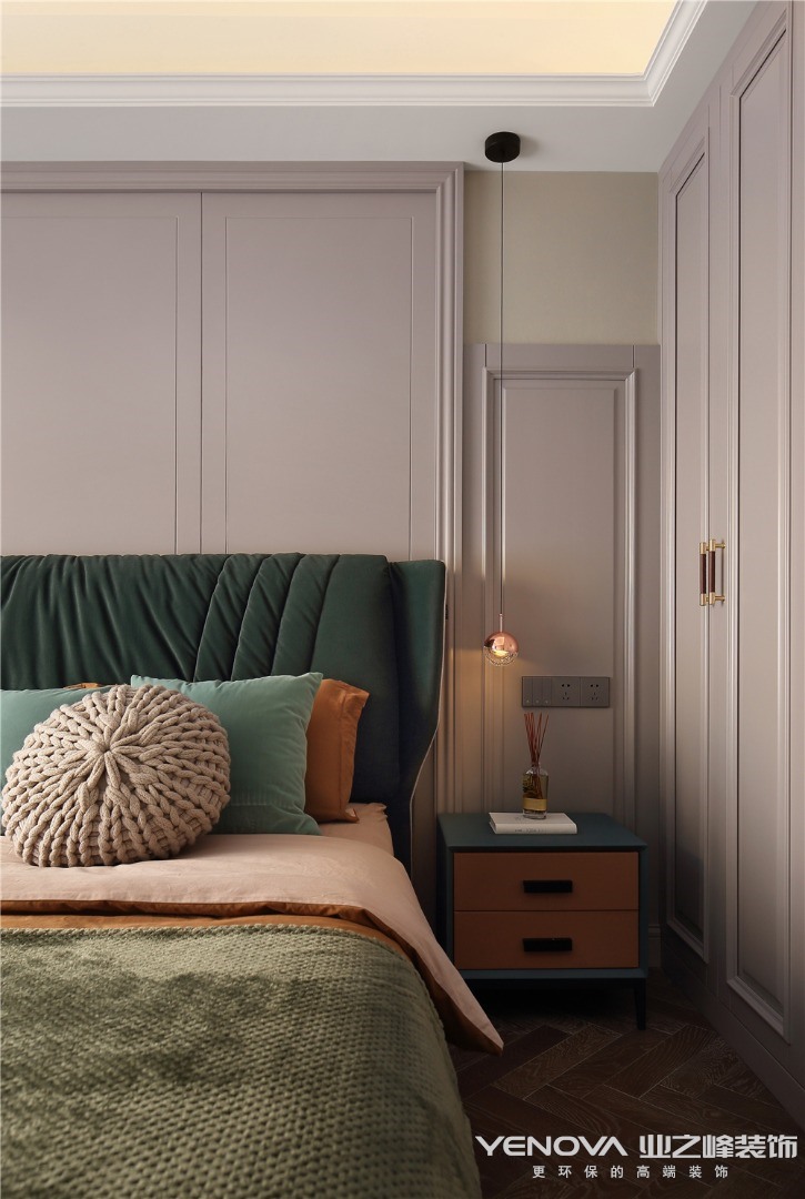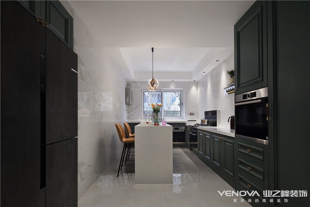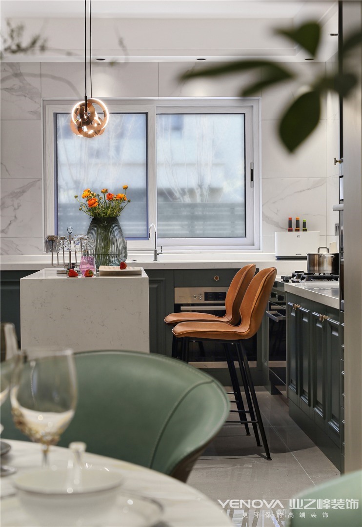 厨房空间打破了原有的米色的温和色调,用墨绿色的木质柜门跟皮质的橘色搭配撞色,让温和的空间增加了更多的趣味与层次。闲暇午后,一杯咖啡,一束窗外的阳光,一只吧台上的花朵,都会成为家人休闲时光的一味调剂品。