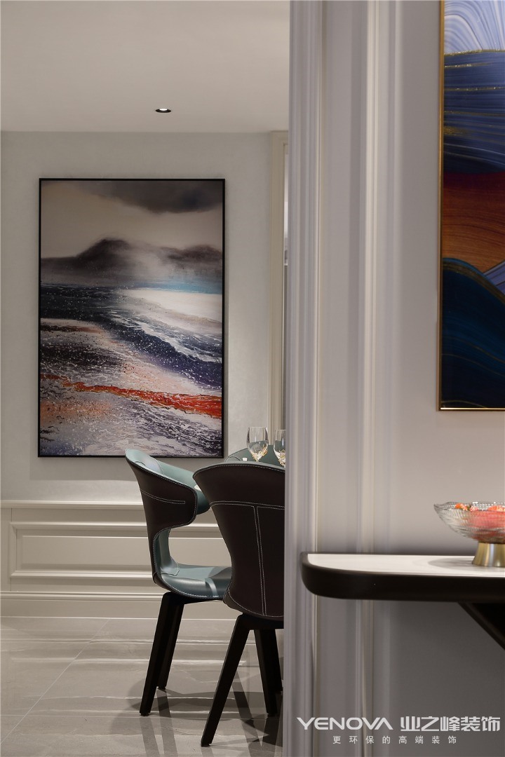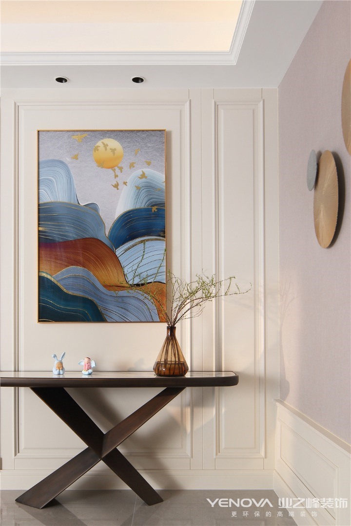 门厅是连接缓冲室内外的地方,因此再整体色调上,我们保证的空间色调的完整性,已一幅颜色明亮,色彩饱和度较高的抽象派 “旭日东升”点缀,配合些许同色调的玻璃花瓶,让整体温暖明亮且有层次。