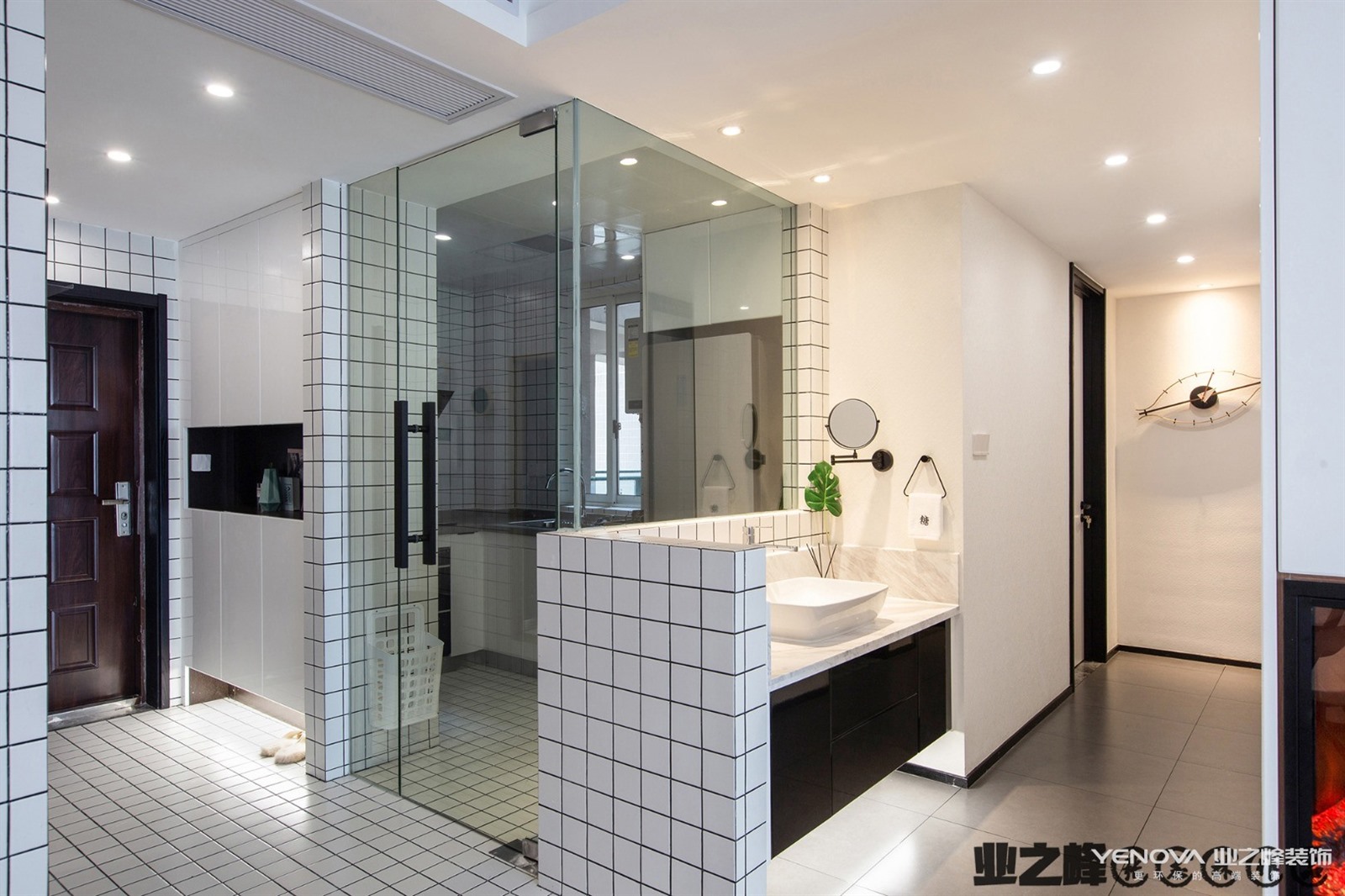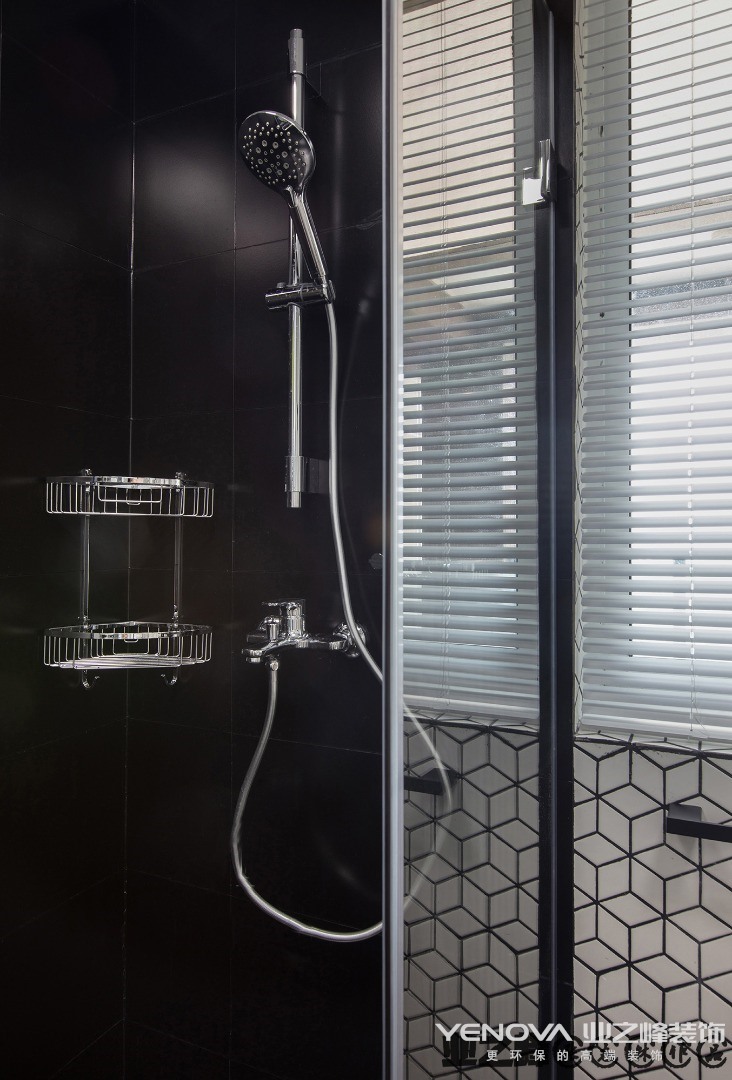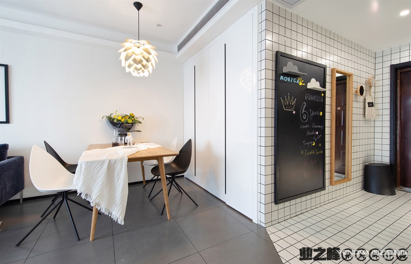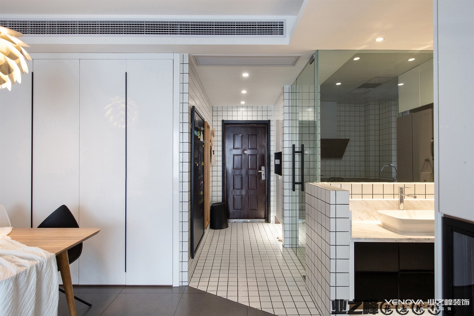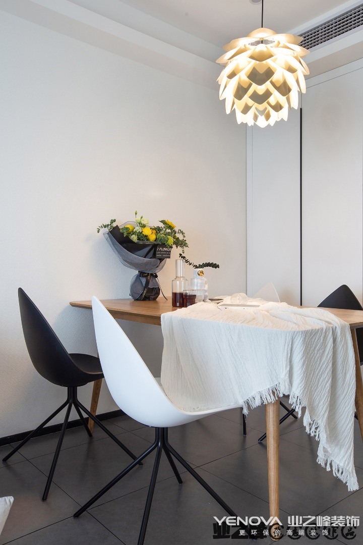 生活区不大,以极简主义风格设计为主。客厅、餐厅、厨房没有隔断,模糊的界限构成。吊灯的设计前卫、艺术感十足。黑色的橱柜与白色墙体形成鲜明对比。主卫使用大理石瓷砖铺贴,搭配黑色洗漱台、白色洁具、时尚的灯带的设计,简约、实用。