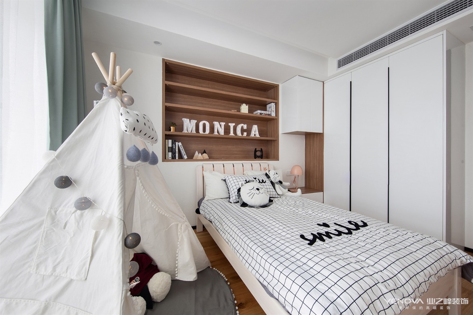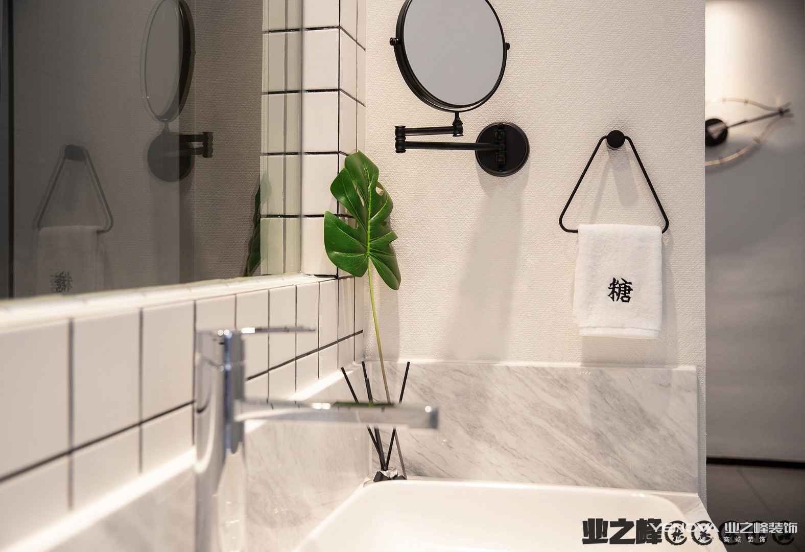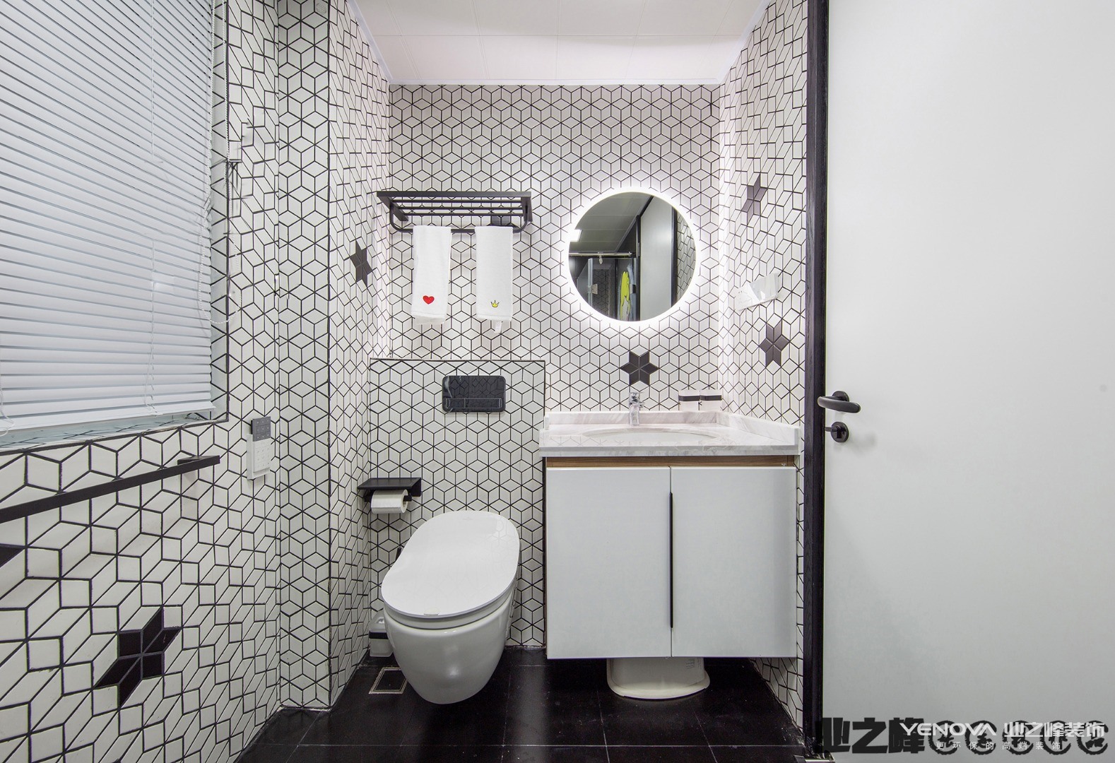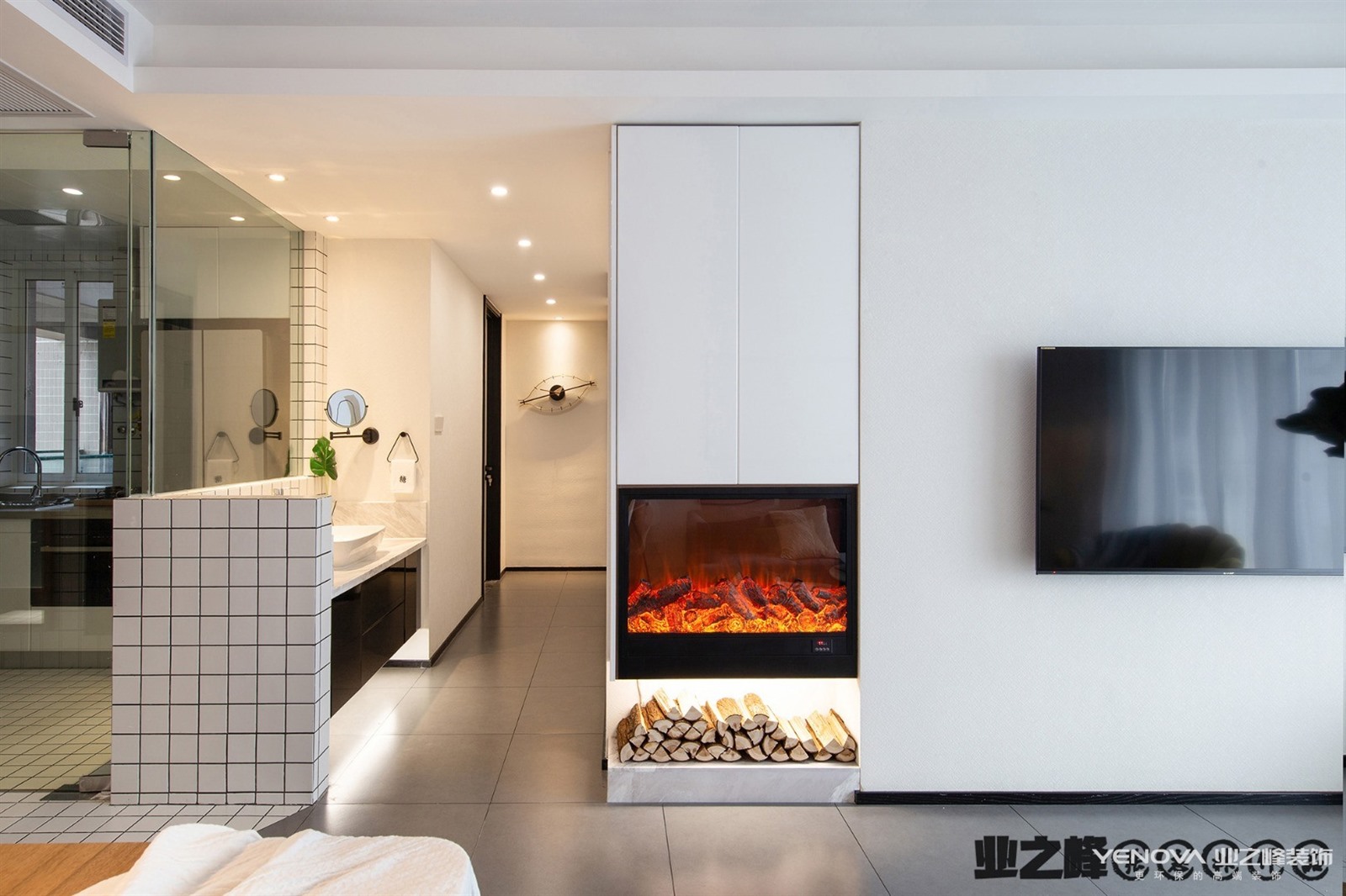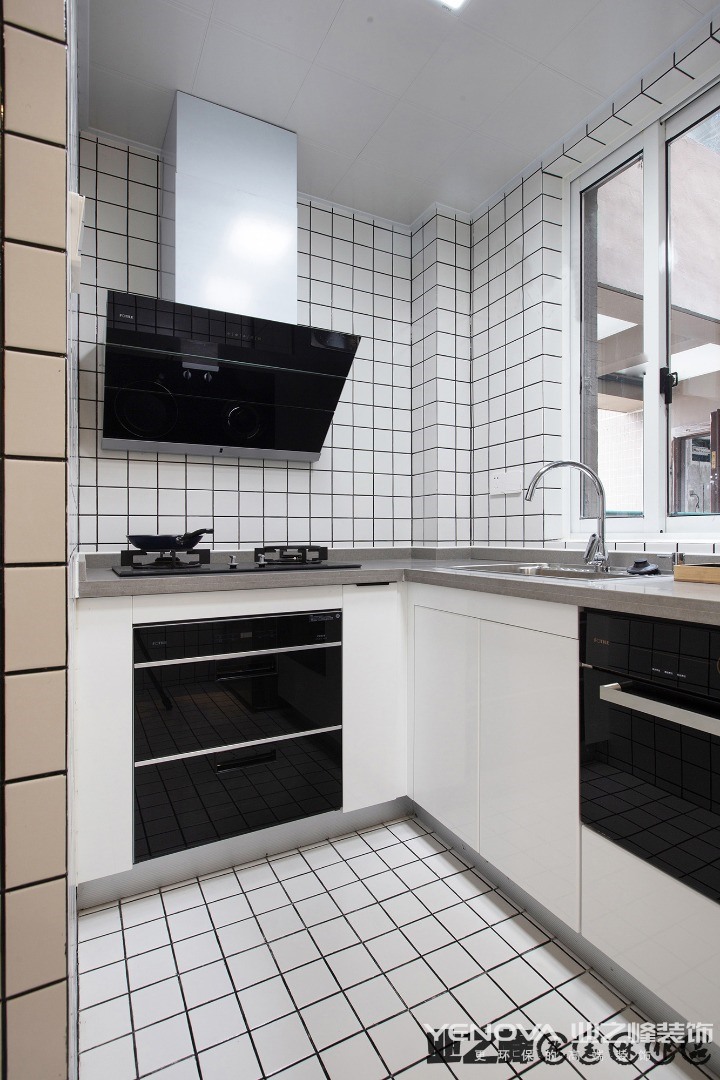 生活区不大,以极简主义风格设计为主。客厅、餐厅、厨房没有隔断,模糊的界限构成。吊灯的设计前卫、艺术感十足。黑色的橱柜与白色墙体形成鲜明对比。主卫使用大理石瓷砖铺贴,搭配黑色洗漱台、白色洁具、时尚的灯带的设计,简约、实用。