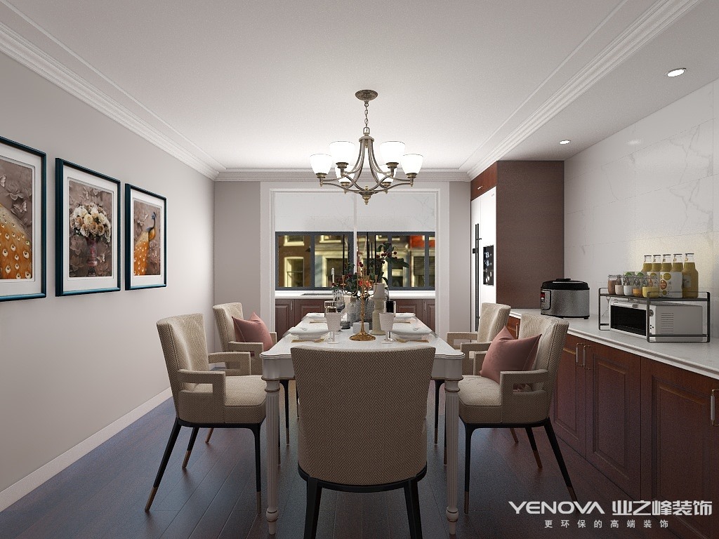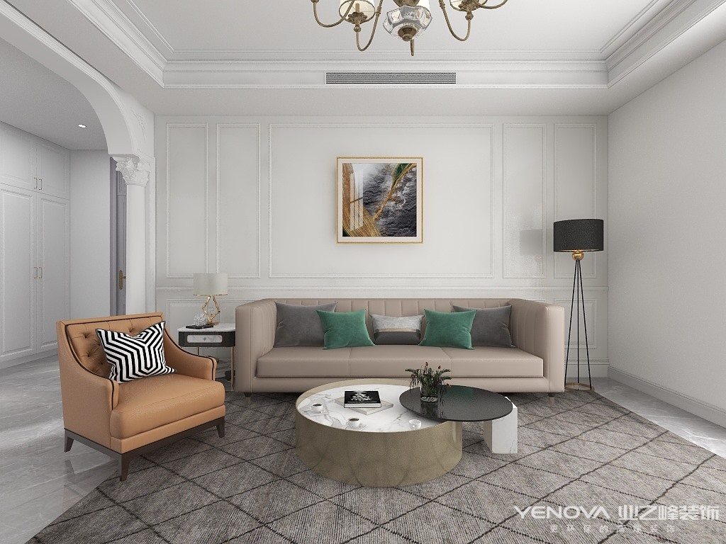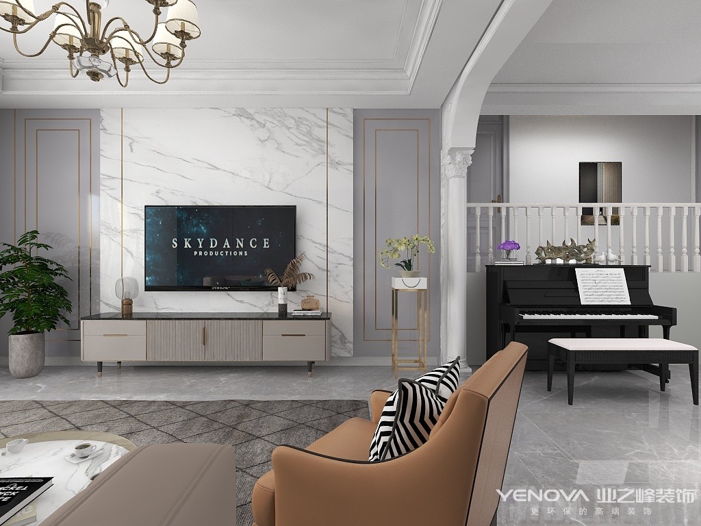 沙发背景墙选用了带有石膏线的白色木饰面板,在墙上悬挂了带金属边条的挂画。电视背景墙选用了两边灰色中间大理石的背景,而且带有金属边条点缀,整体自然流畅。主卧整体视觉柔和而不失质感,背景墙与壁灯的搭配带来了金属的质感和隐秘的情调,衣柜整体灰色系,使整个空间搭配起来更加简洁明了。餐厅设计整体以暖色调为主,地板和地柜都采用柚木色,以白色餐桌来分割颜色,墙面采用暖灰色乳胶漆,搭配石膏顶线,色调和线条的碰撞,整个空间更俏皮,富有趣味。主卫的空间足够大,整体色调干净而清新,偶尔点缀一些金属,让鲜艳的色泽给空间带来活力。