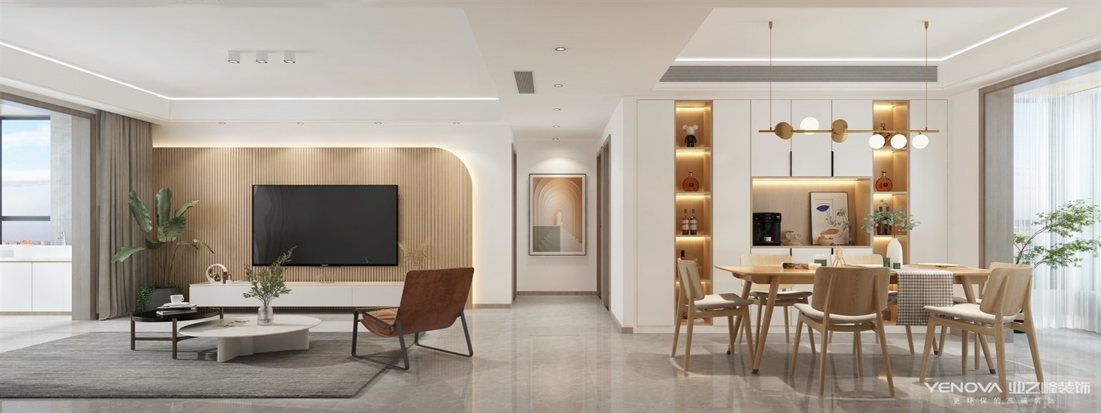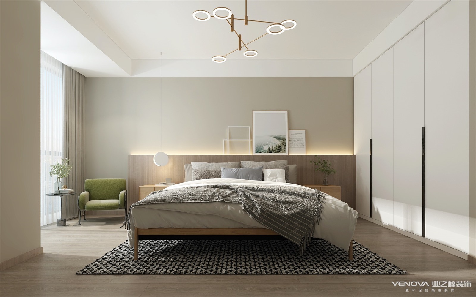 客餐厅作为业主每天的主要生活空间,本案列客餐厅区域划分合理,却又不缺少视觉通透感,本案为现代简约风格,因此在色彩搭配上采用了大面积留白辅以浅棕色家具点明风格,电视背景墙为本空间的点睛之处,圆弧的背景墙以及灯带的造型为空间赋予灵魂。根据业主对生活的品质和需求,全屋采用温暖的色调床头背景墙采用了硬包造型显得端庄稳重,灯带与咖色的背景墙相碰撞,擦出微妙的火花。吊顶简约大气,提升空间层次感。