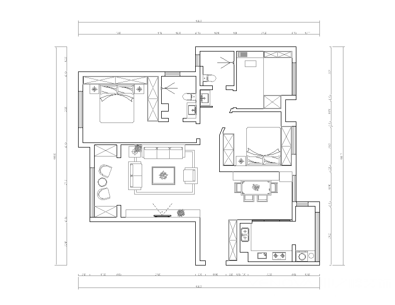 本套案例围绕着新中式风格为主,主人年龄在42岁左右,喜欢沉稳的风格,偶尔要多一些奢华的元素进去,主打色调以冷色系为主,进门采用整体鞋柜玄关遮挡,既体现了鞋柜功能,又很有效的分离了门厅客厅区域,电视墙使用整幅壁画相呼应,米黄色的瓷砖地面,全房实木家具衬托,让整个家里看上去明亮又有档次整体色调以灰 白 红,为主,简单的吊顶射灯,完全体现了中年人的的独特韵味户型图