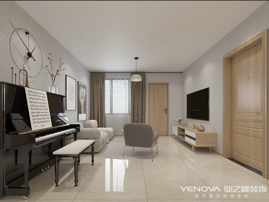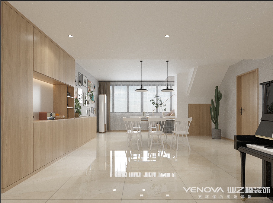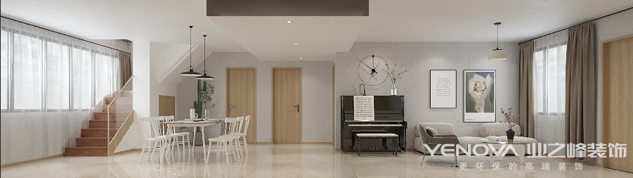 本案为现代简约风格,却又不缺少视觉通透感,,因此在色彩搭配上采用了大面积留白辅以浅棕色家具点明风格,客餐一体式的设计越来越流行,在视觉上增添了空间的通透宽敞。白色的餐椅看起来更有质感,与餐桌上方吊灯相呼应,创造一个简约优雅的氛围。