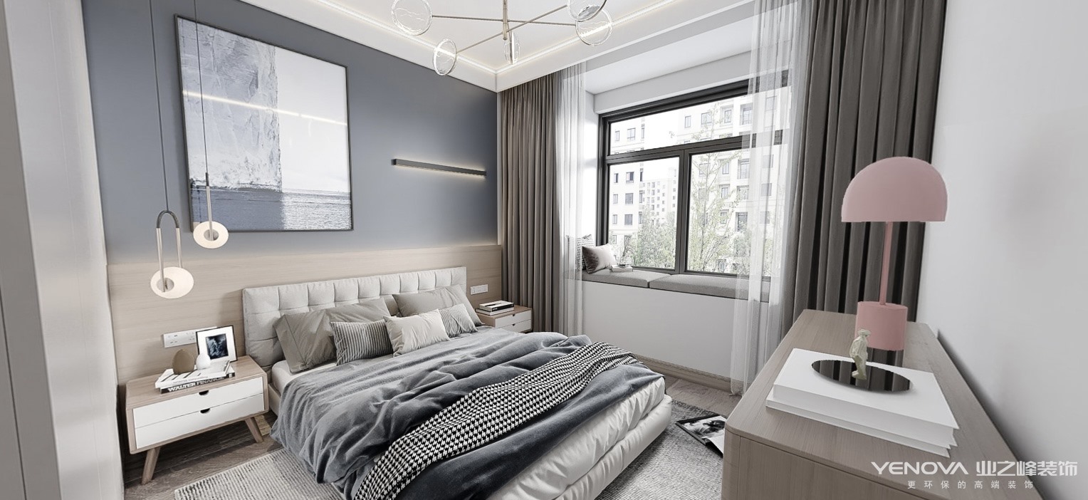 主卧空间,采用莫兰迪蓝和浅咖色的碰撞,彰显着业主的品味。床头背景墙采用了硬包造型显得端庄稳重,床头的吊线灯增加了情趣。吊顶的一圈灯线,增添了空间的丰富性。